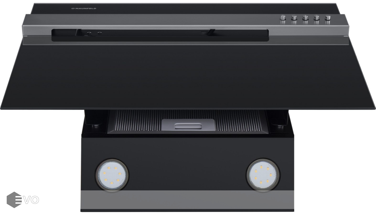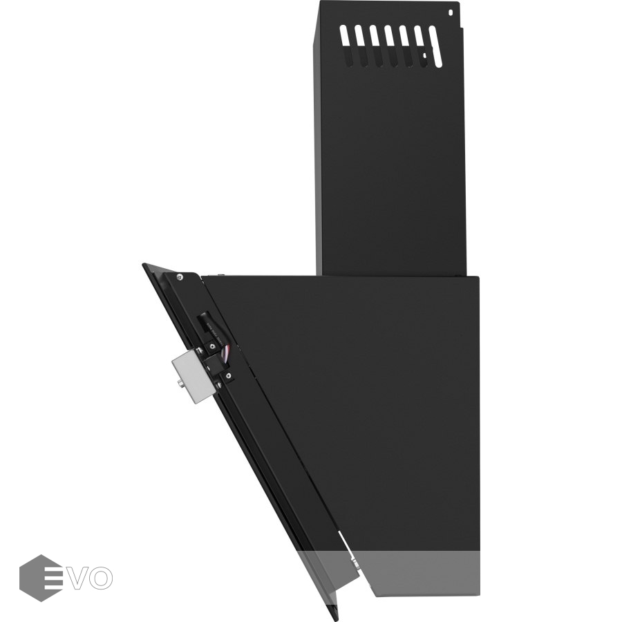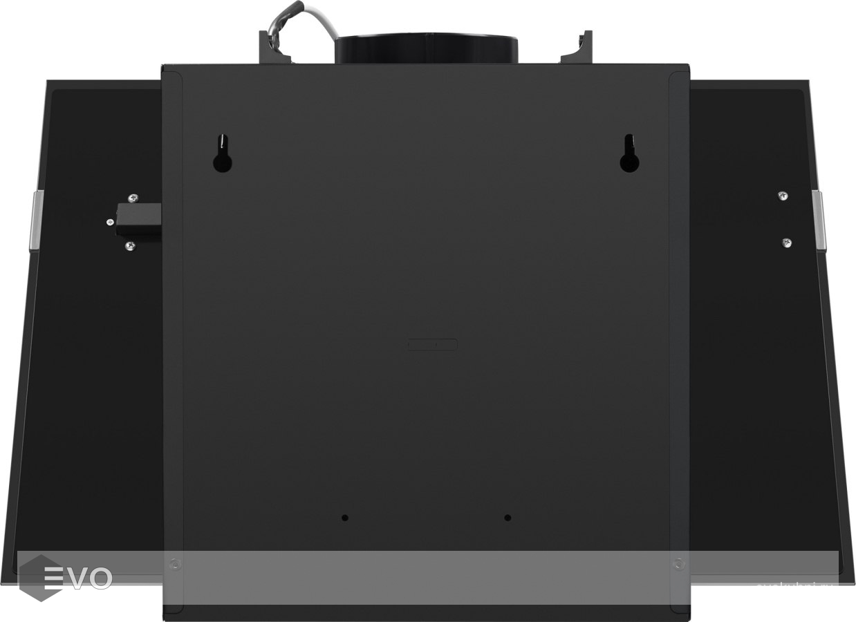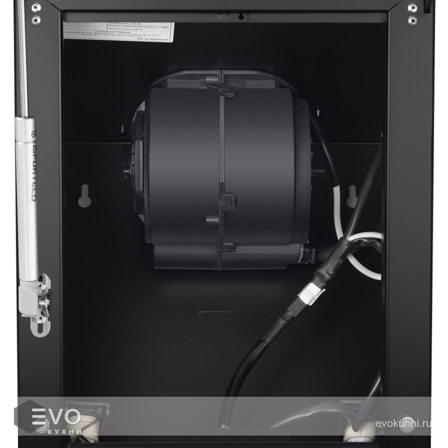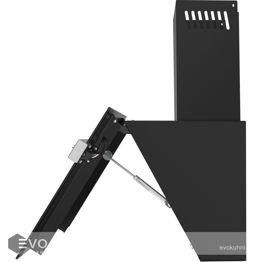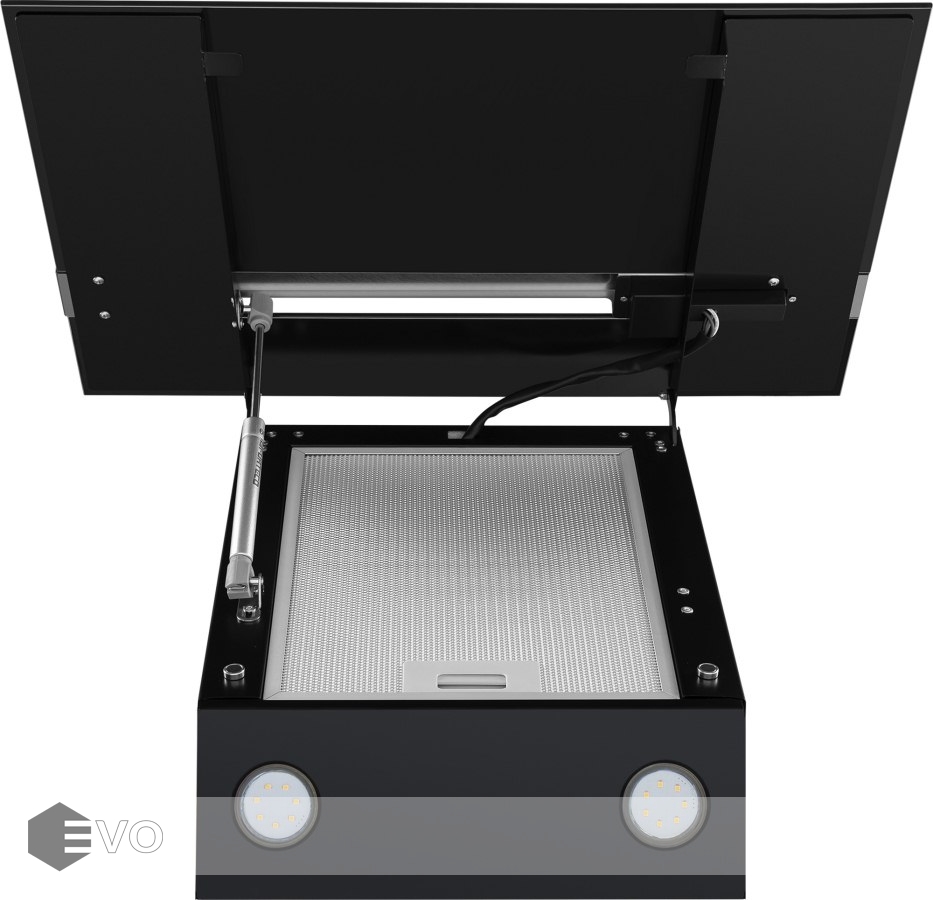 Корпус выполнен из нержавеющей стали. Откидной фасад из закаленного стекла черного цвета с металлической вставкой оснащен пневматической системой газ-лифт, позволяющей надежно фиксировать дверцу в открытом состоянии. За фасадом находится многослойный жироулавливающий фильтр, который легко вынимается и полностью разбирается, что сильно упрощает его чистку.