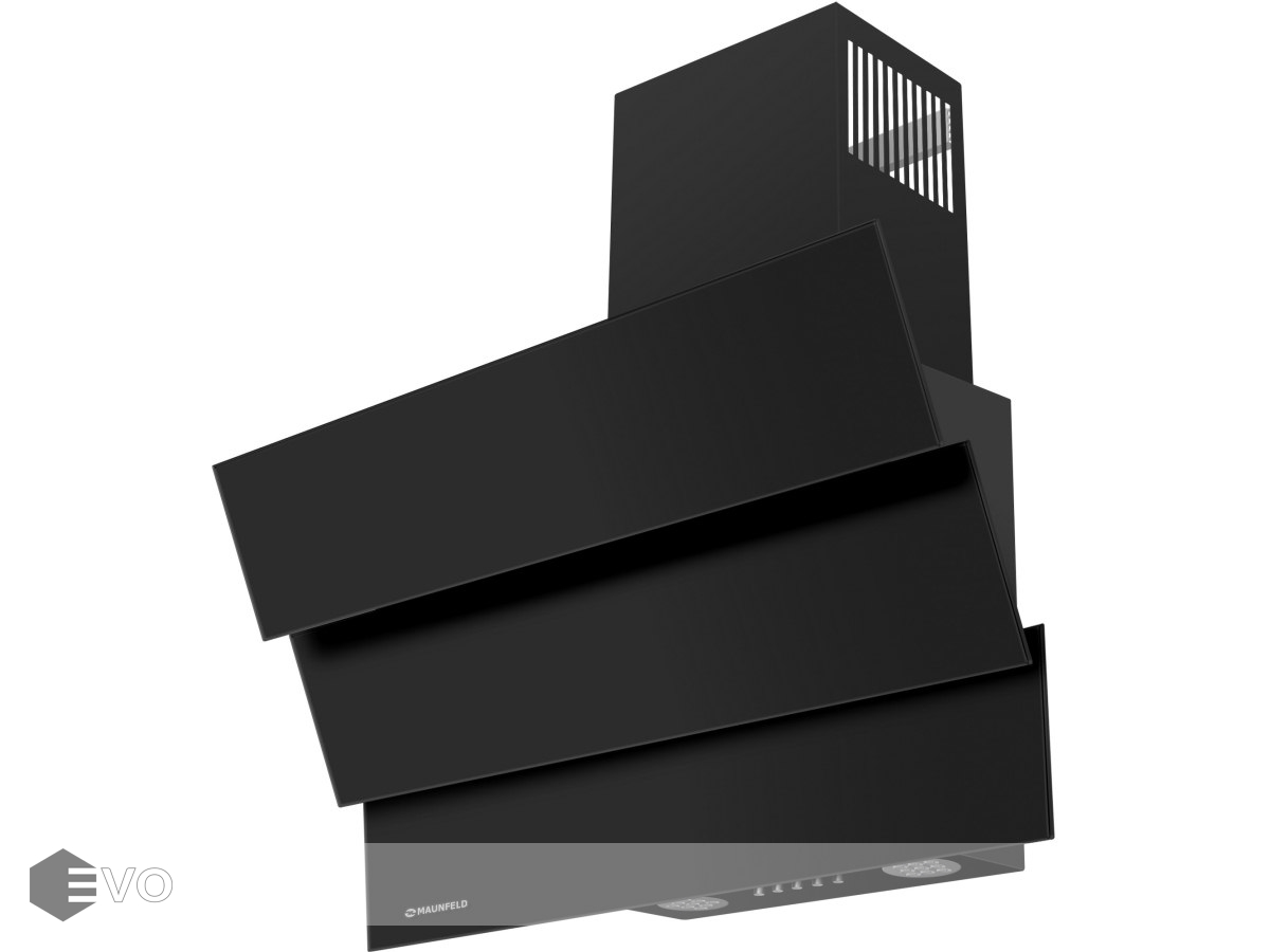 Корпус выполнен из нержавеющей стали. Дизайнерский фасад представляет собой каскад из 3-х сверхпрочных закаленных глянцевых стекол в цвет корпуса. Благодаря такому расположению панелей, принцип периметрического втягивания воздуха действует особенно эффективно. Две верхние откидные панели скрывают многослойный жироулавливающий фильтр, который легко снимается и полностью разбирается, что сильно упрощает чистку.