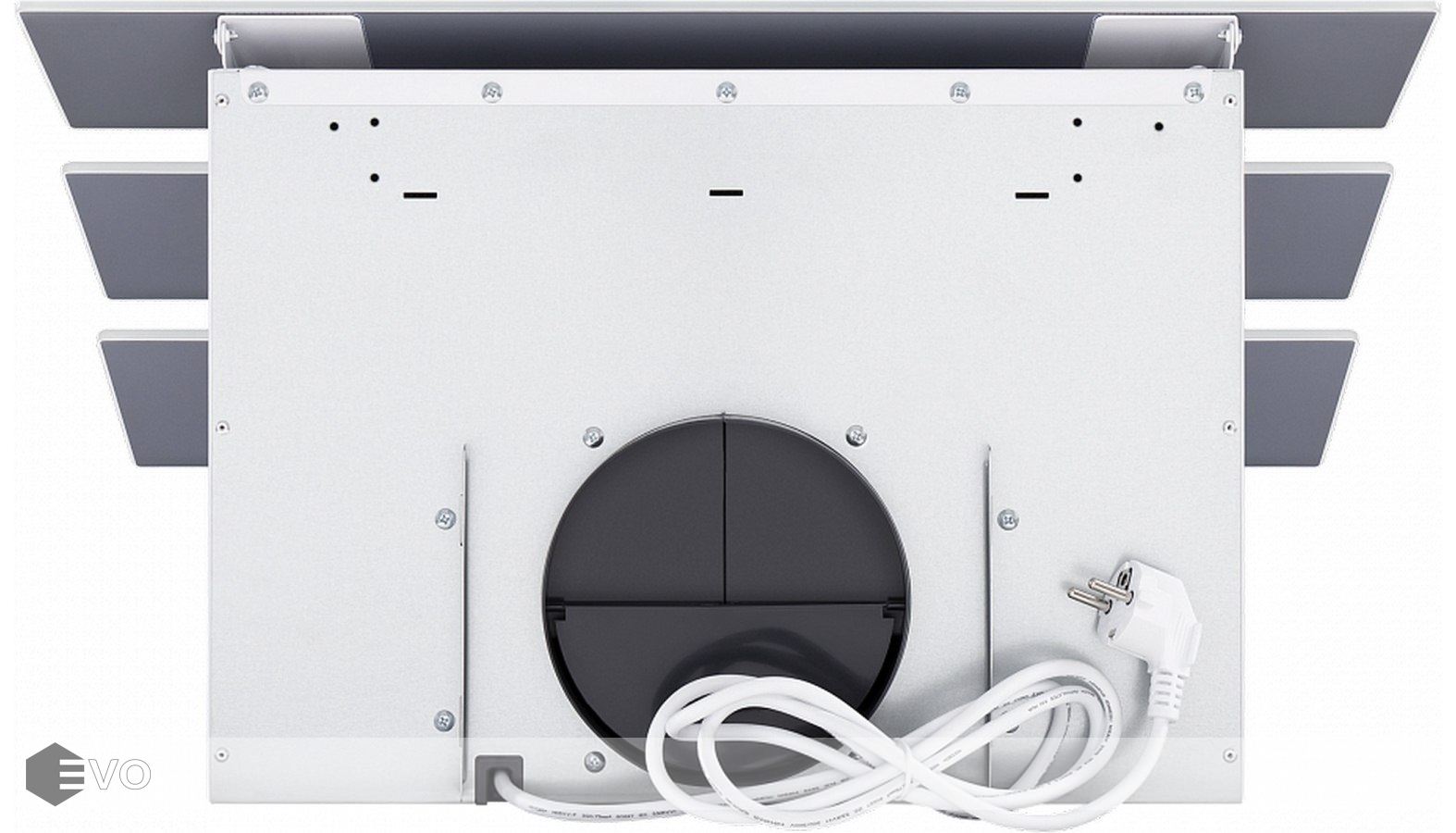 Корпус выполнен из нержавеющей стали. Дизайнерский фасад представляет собой каскад из 3-х сверхпрочных закаленных глянцевых стекол в цвет корпуса. Благодаря такому расположению панелей, принцип периметрического втягивания воздуха действует особенно эффективно. Две верхние откидные панели скрывают алюминиевый многослойный жироулавливающий фильтр, который легко снимается и полностью разбирается, что сильно упрощает его чистку.