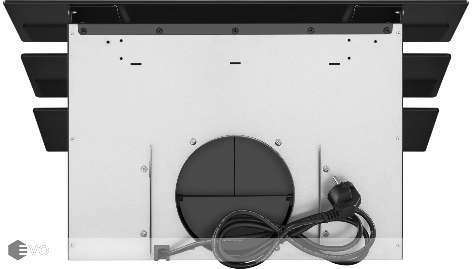 Корпус выполнен из нержавеющей стали. Дизайнерский фасад представляет собой каскад из 3-х сверхпрочных закаленных глянцевых стекол в цвет корпуса. Благодаря такому расположению панелей, принцип периметрического втягивания воздуха действует особенно эффективно. Две верхние откидные панели скрывают алюминиевый многослойный жироулавливающий фильтр, который легко снимается и полностью разбирается, что сильно упрощает его чистку.