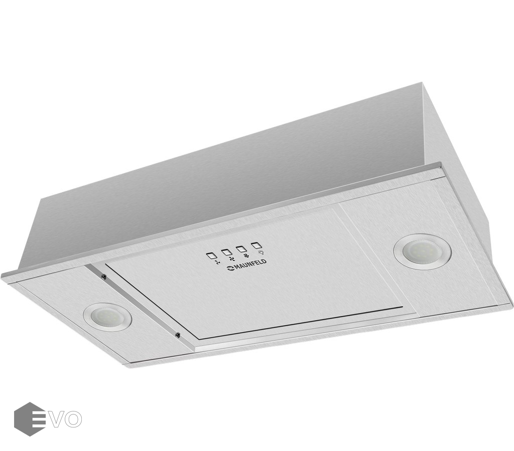Полновстраиваемая вытяжка MAUNFELD Crosby Flat 52 нержавеющая сталь – встраиваемая кухонная вытяжка шириной 52 см – прекрасное решение для кухни площади до 40 кв.м. Модель встраивается в навесной шкаф над поверхностью плиты. Работает в двух режимах – отвода (при подключении к системе вентиляции) и рециркуляции (при использовании сменного угольного фильтра).