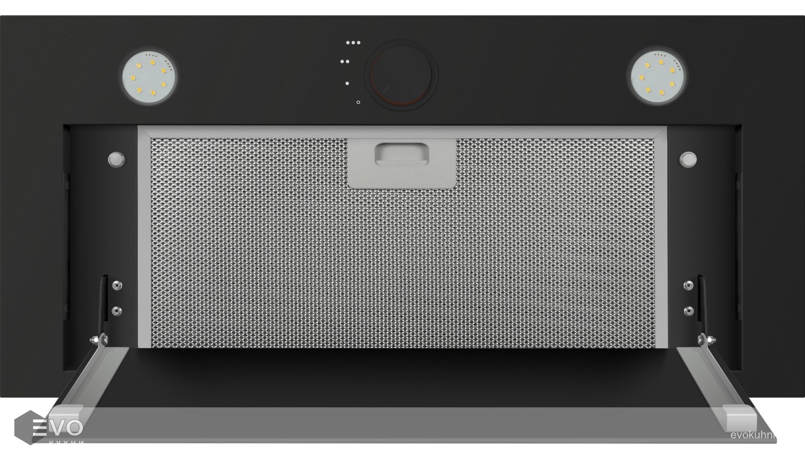 Корпус сделан из нержавеющей стали. На фасаде находится откидная панель, выполненная из закаленного стекла. За ней располагается легко снимающийся жироулавливающий алюминиевый фильтр. Загрязненный воздух втягивается по периметру откидной панели. Выбор одного из 3-х режимов работы вытяжки осуществляется с помощью поворотного переключателя с красной полосой. Нажав на переключатель как на кнопку, вы включаете освещение.