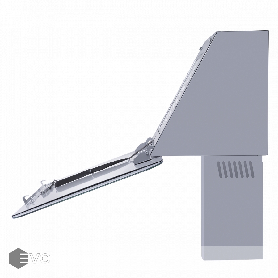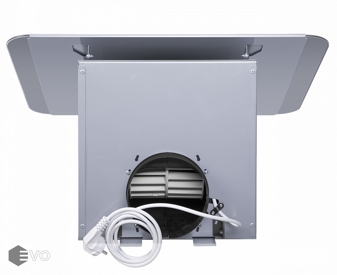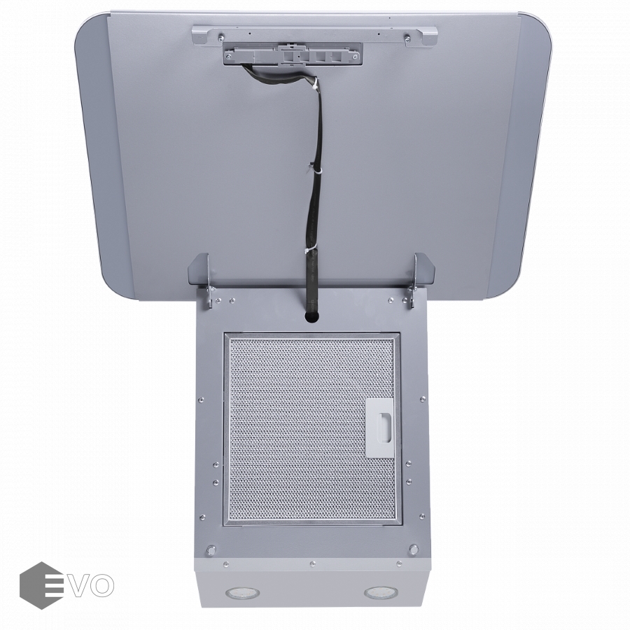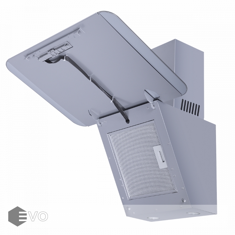 Откидной фасад сделан из закаленного стекла под цвет корпуса и является сменным элементом, и при смене интерьера кухни его можно заменить на стекло другого цвета. За ним находится алюминиевый жироулавливающий фильтр, который легко снимается и полностью разбирается, что сильно упрощает чистку. Загрязненный воздух втягивается по периметру откидной панели.