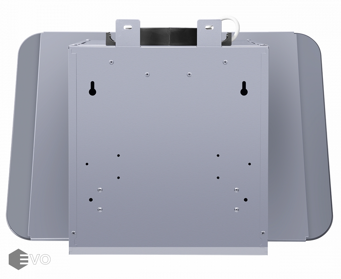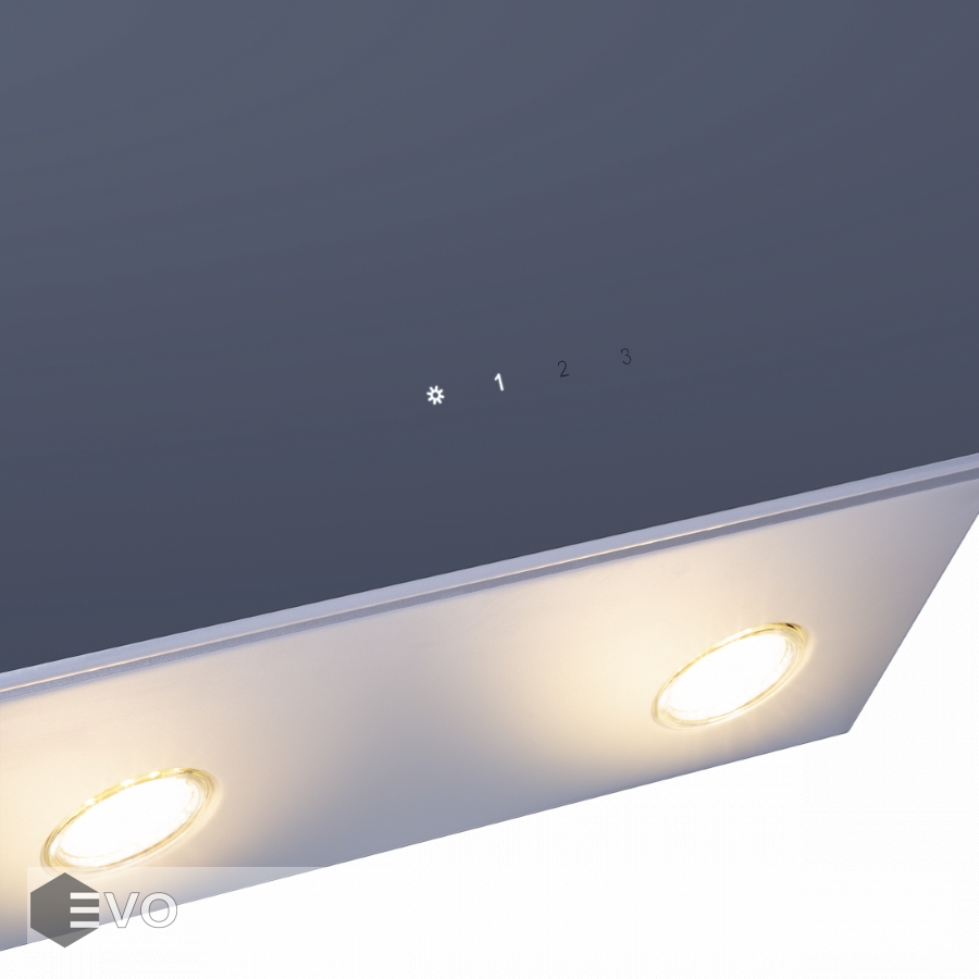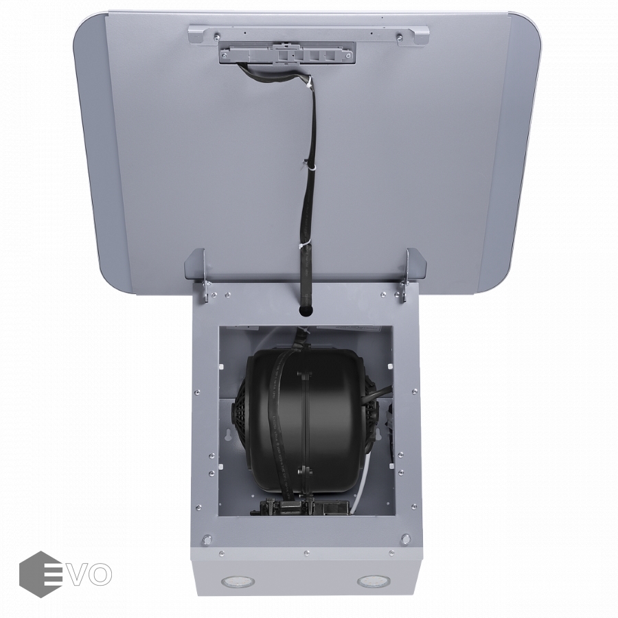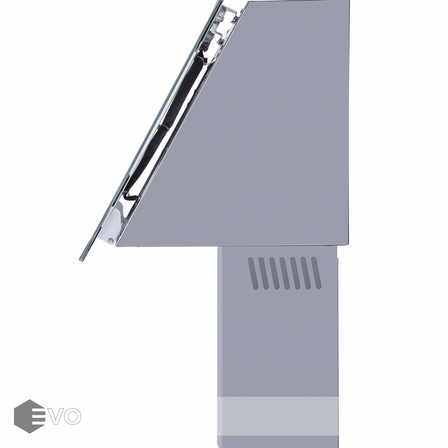 Откидной фасад сделан из закаленного стекла под цвет корпуса и является сменным элементом, и при смене интерьера кухни его можно заменить на стекло другого цвета. За ним находится алюминиевый жироулавливающий фильтр, который легко снимается и полностью разбирается, что сильно упрощает чистку. Загрязненный воздух втягивается по периметру откидной панели.