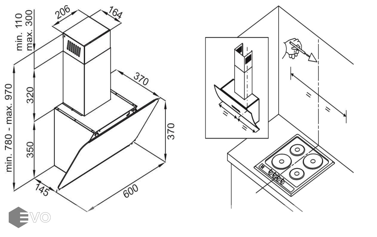 • Высота установки над электрическими варочными поверхностями, мм: 550