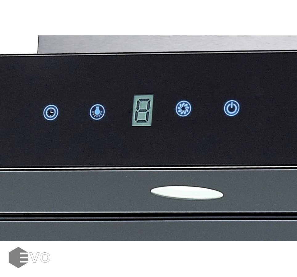 Корпус выполнен из матированной нержавеющей стали, рабочая поверхность черного цвета сделана из закаленного стекла. Откидная панель скрывает алюминиевый многослойный жироулавливающий фильтр. Он легко вынимается и полностью разбирается, что сильно упрощает чистку. Для управления вытяжкой используется сенсорная панель, с помощью которой можно установить один из 3-х скоростных режимов разной степени интенсивности, выставить таймер и включить освещение.