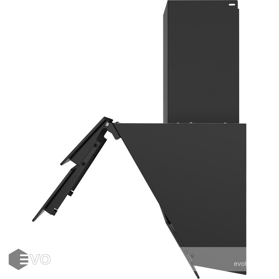 Корпус выполнен из нержавеющей стали. Дизайнерский фасад представляет собой каскад из 3-х сверхпрочных закаленных глянцевых стекол черного цвета. Благодаря такому расположению панелей принцип периметрического втягивания воздуха действует особенно эффективно. Многослойный алюминиевый жироулавливающий фильтр, скрытый за двумя верхними откидными панелями, легко вынимается и полностью разбирается, что сильно упрощает чистку.