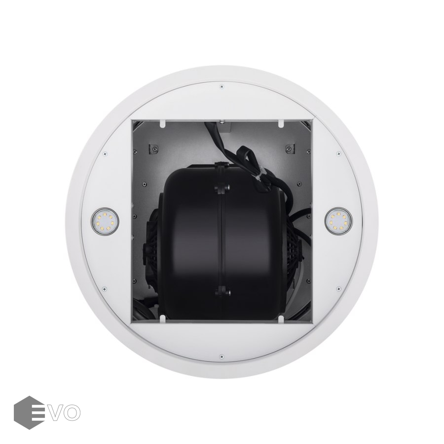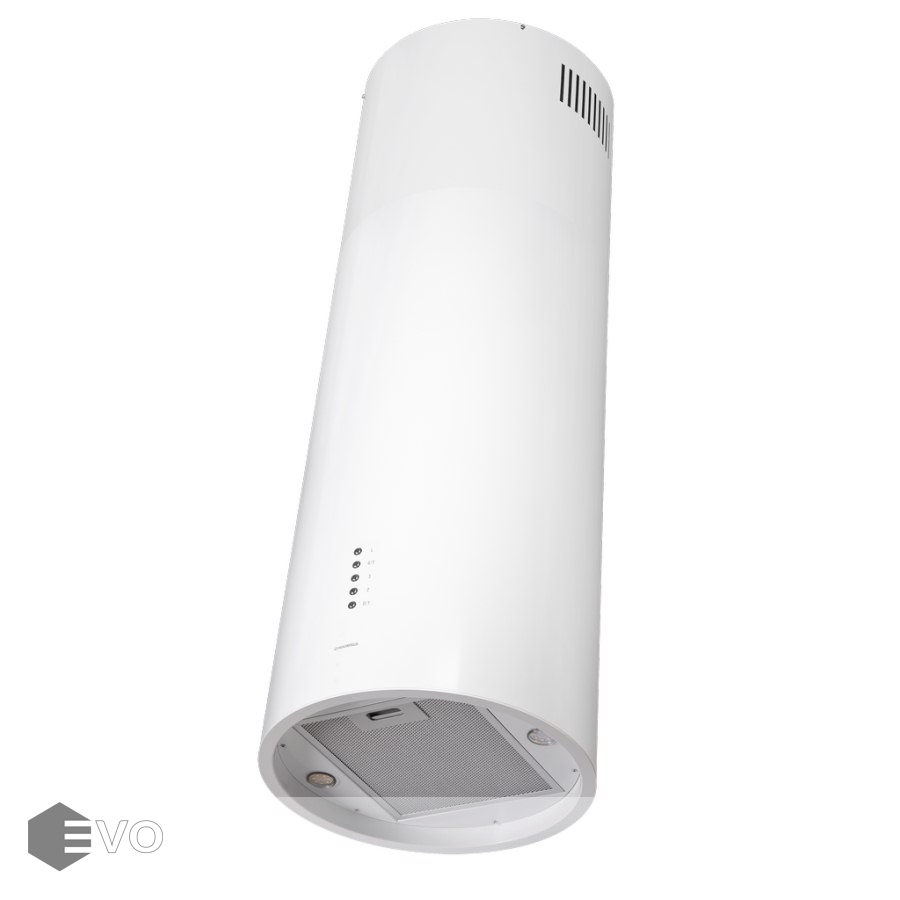 Корпус цилиндрической формы, выполненный из нержавеющей стали, крепится на потолок над поверхностью плиты. В нижней части вытяжки находится алюминиевый многослойный жироулавливающий фильтр. Сенсорное управление с подсветкой позволит выбрать один из 4-х режимов работы вентилятора, выставить таймер и включить 2 светодиодные лампочки (2,2 Вт), расположенные по бокам от фильтра.