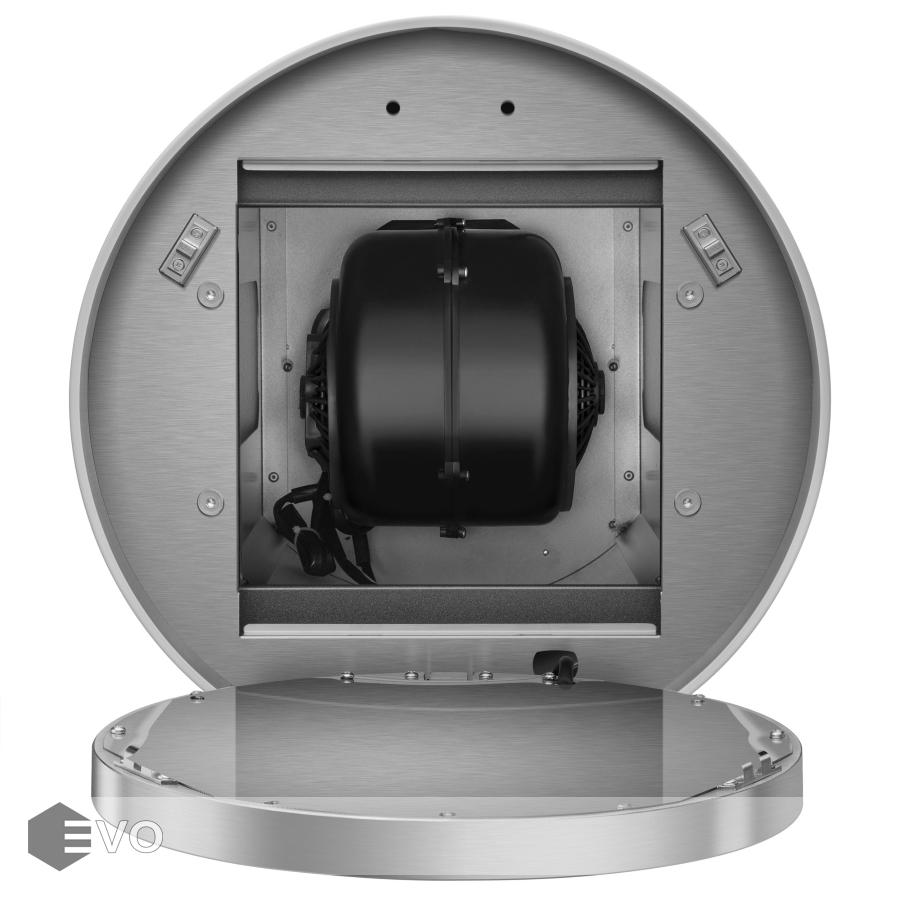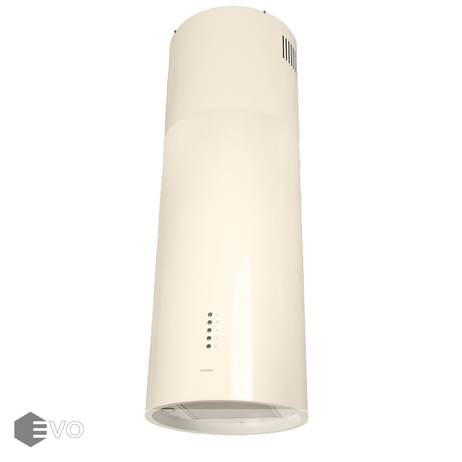 Корпус цилиндрической формы, выполненный из нержавеющей стали, крепится на потолок над поверхностью плиты. В нижней части вытяжки находится алюминиевый многослойный жироулавливающий фильтр. Сенсорное управление с подсветкой позволит выбрать один из 4-х режимов работы вентилятора, выставить таймер и включить 2 светодиодные лампочки (2,2 Вт), расположенные по бокам от фильтра.