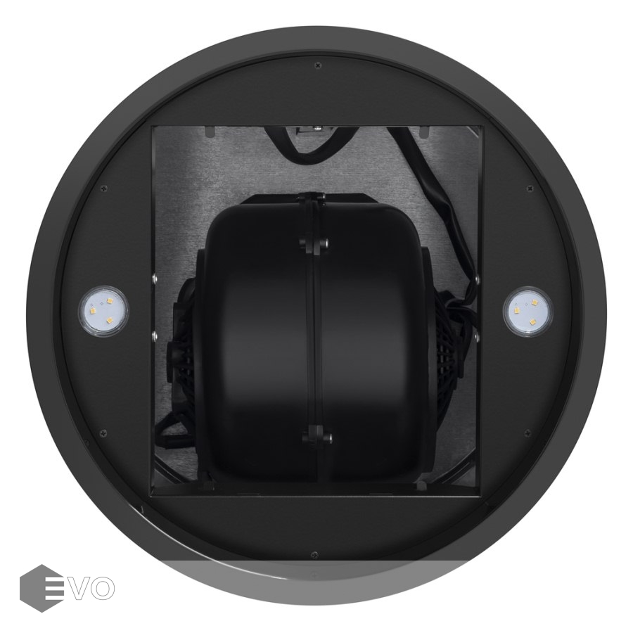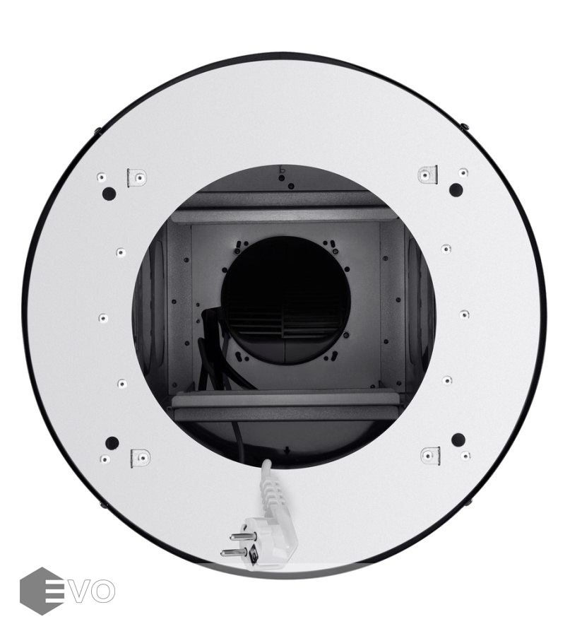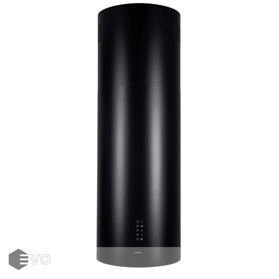 Корпус цилиндрической формы, выполненный из нержавеющей стали, крепится на потолок над поверхностью плиты. В нижней части вытяжки находится алюминиевый многослойный жироулавливающий фильтр. Сенсорное управление с подсветкой позволит выбрать один из 4-х режимов работы вентилятора, выставить таймер и включить 2 светодиодные лампочки (2,2 Вт), расположенные по бокам от фильтра.