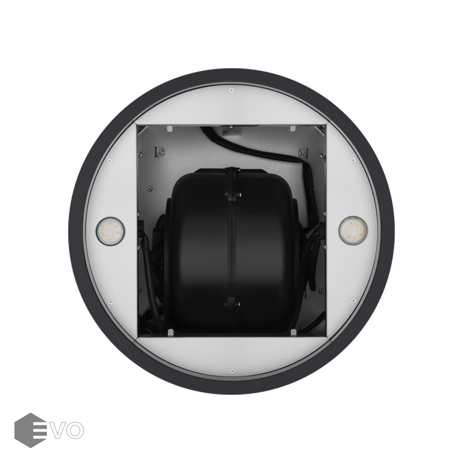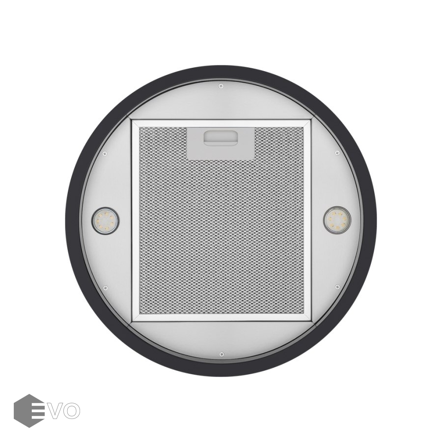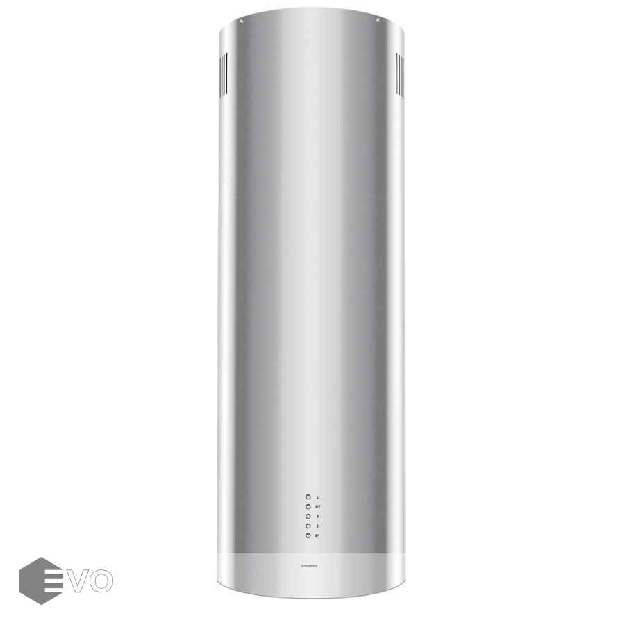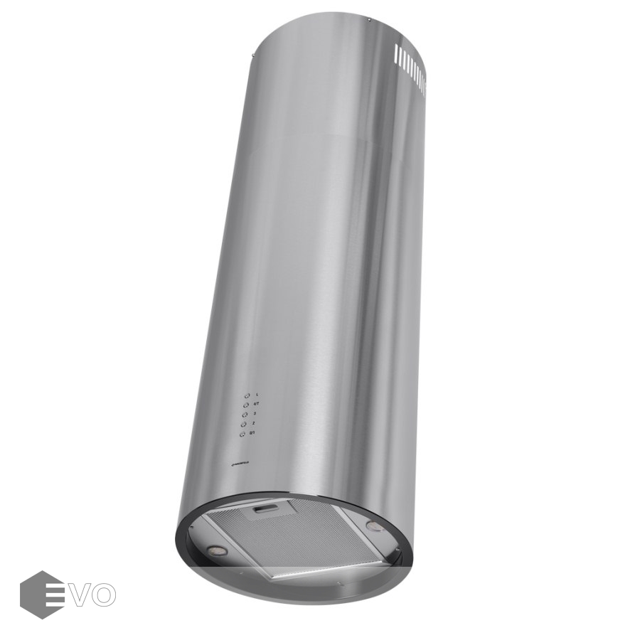 Корпус цилиндрической формы, выполненный из нержавеющей стали, крепится на потолок над поверхностью плиты. В нижней части вытяжки находится алюминиевый многослойный жироулавливающий фильтр. Сенсорное управление с подсветкой позволит выбрать один из 4-х режимов работы вентилятора, выставить таймер и включить 2 светодиодные лампочки (2,2 Вт), расположенные по бокам от фильтра.