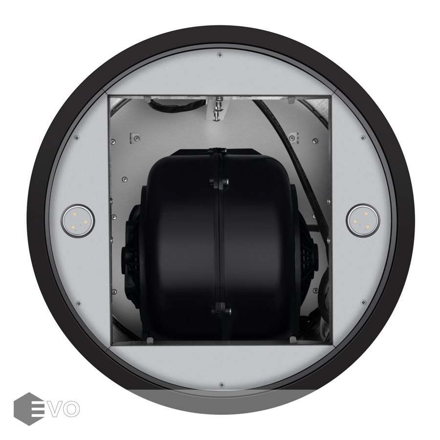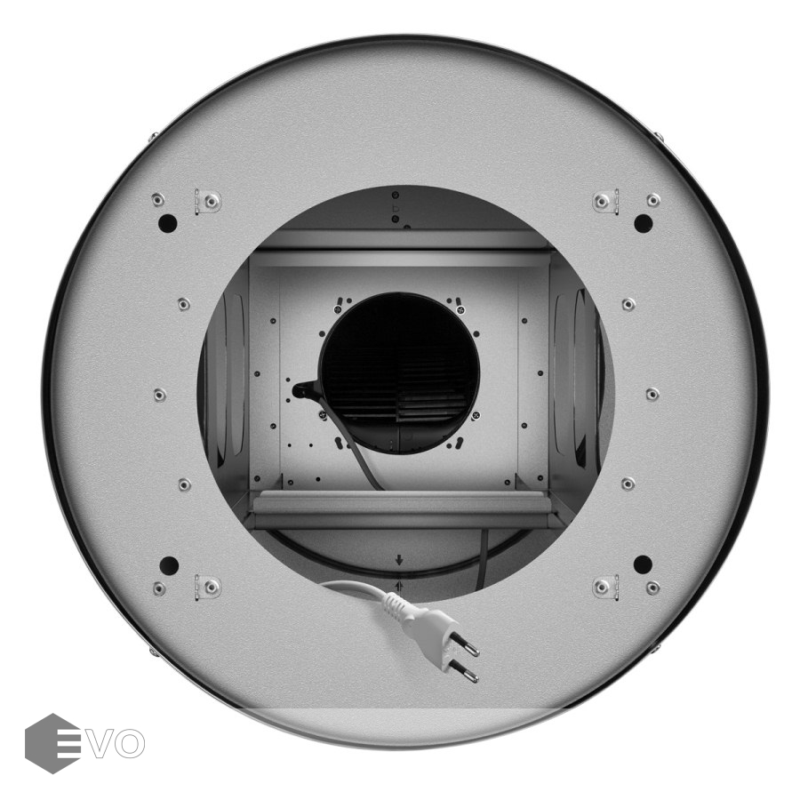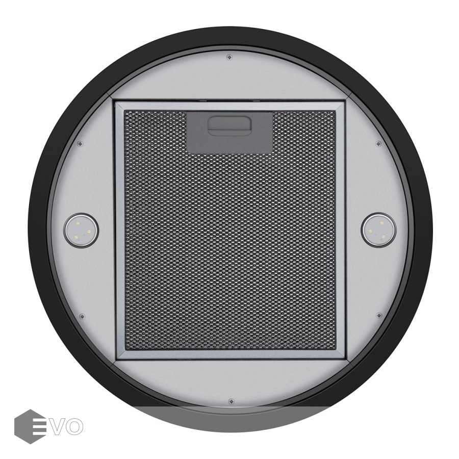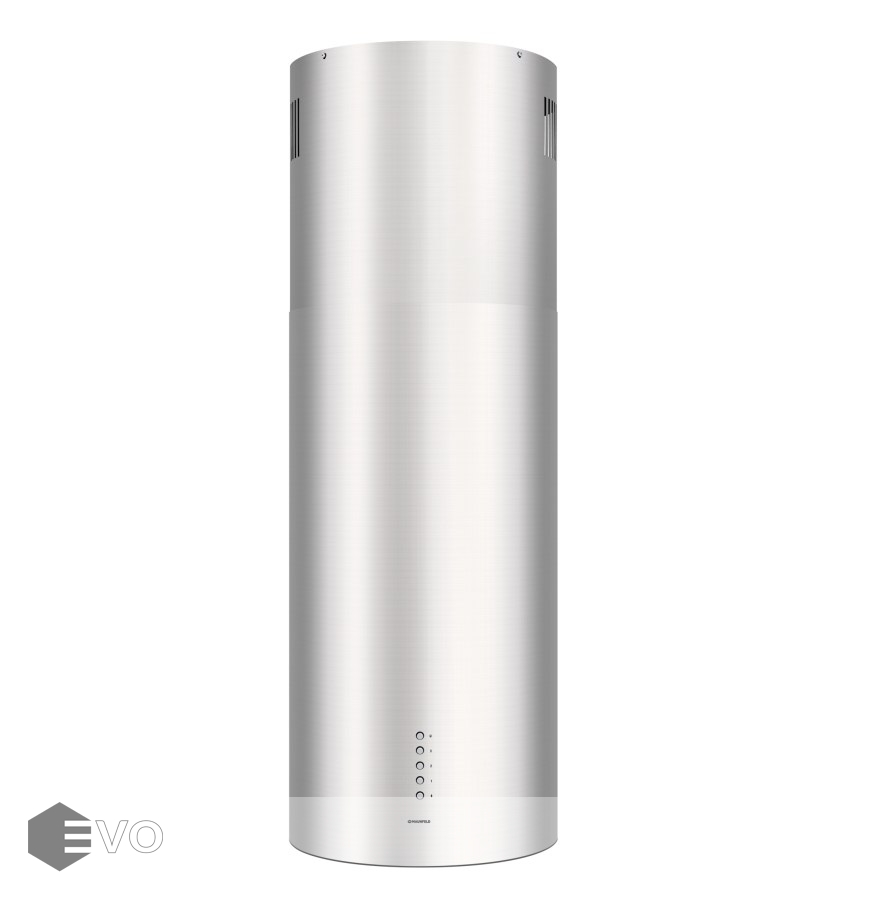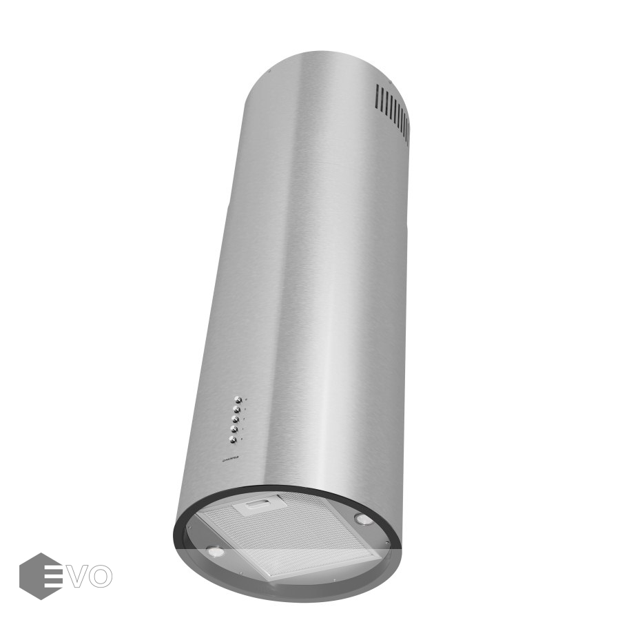 Корпус цилиндрической формы, выполненный из нержавеющей стали с термостойким покрытием, монтируется на потолок над варочной поверхностью. В нижнем торце вытяжки расположен специальный многослойный жироулавливающий фильтр, который легко вынимается и полностью разбирается для чистки.