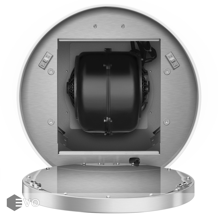 Корпус цилиндрической формы, сделанный из нержавеющей стали с термостойким покрытием, монтируется на стену над варочной поверхностью. Специальный многослойный жироулавливающий алюминиевый фильтр, расположенный в нижнем торце, легко снимается и полностью разбирается, что сильно упрощает его чистку.