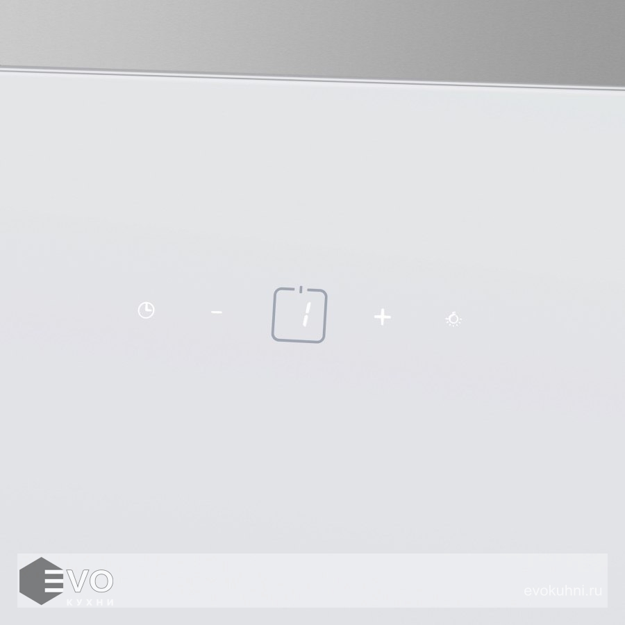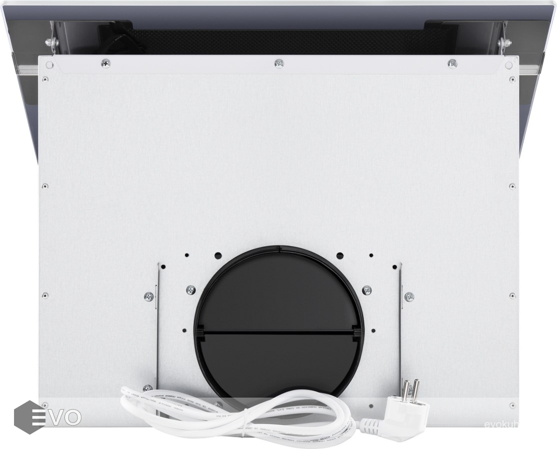 Корпус сделан из нержавеющей стали. Откидная панель выполнена из глянцевого закаленного белого стекла с матированной металлической вставкой и оснащена магнитными фиксаторами и газовыми амортизаторами. За ней скрывается легко снимающийся алюминиевый жироулавливающий фильтр. Загрязненный воздух втягивается по периметру откидной панели.