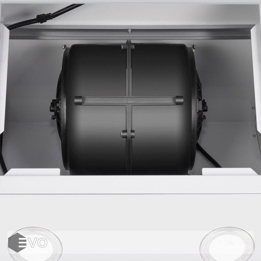 Корпус сделан из нержавеющей стали. Фронтальная часть выполнена из закаленного тонированного белого стекла со стальной вставкой с овальным отверстием, открывающим фильтр. Благодаря такой конструкции тяга поддерживается даже при закрытой откидной панели. Под стеклом расположен многослойный легко снимающийся жироулавливающий фильтр.