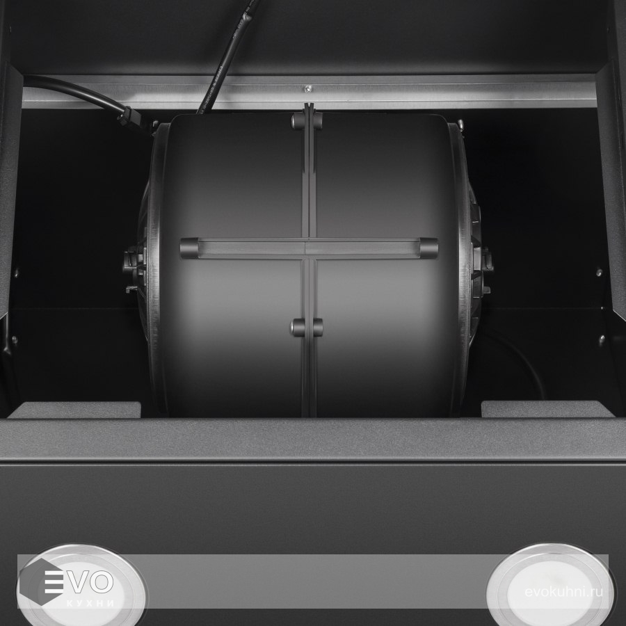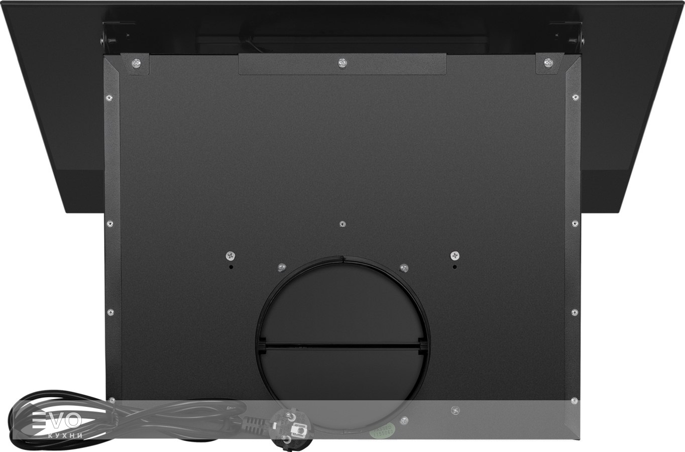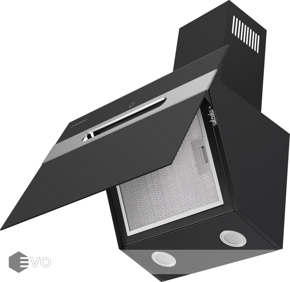 Корпус сделан из нержавеющей стали. Фронтальная часть выполнена из закаленного тонированного черного стекла со стальной вставкой с овальным отверстием, открывающим фильтр. Благодаря такой конструкции тяга поддерживается даже при закрытой откидной панели. Под стеклом расположен многослойный легко снимающийся жироулавливающий фильтр.