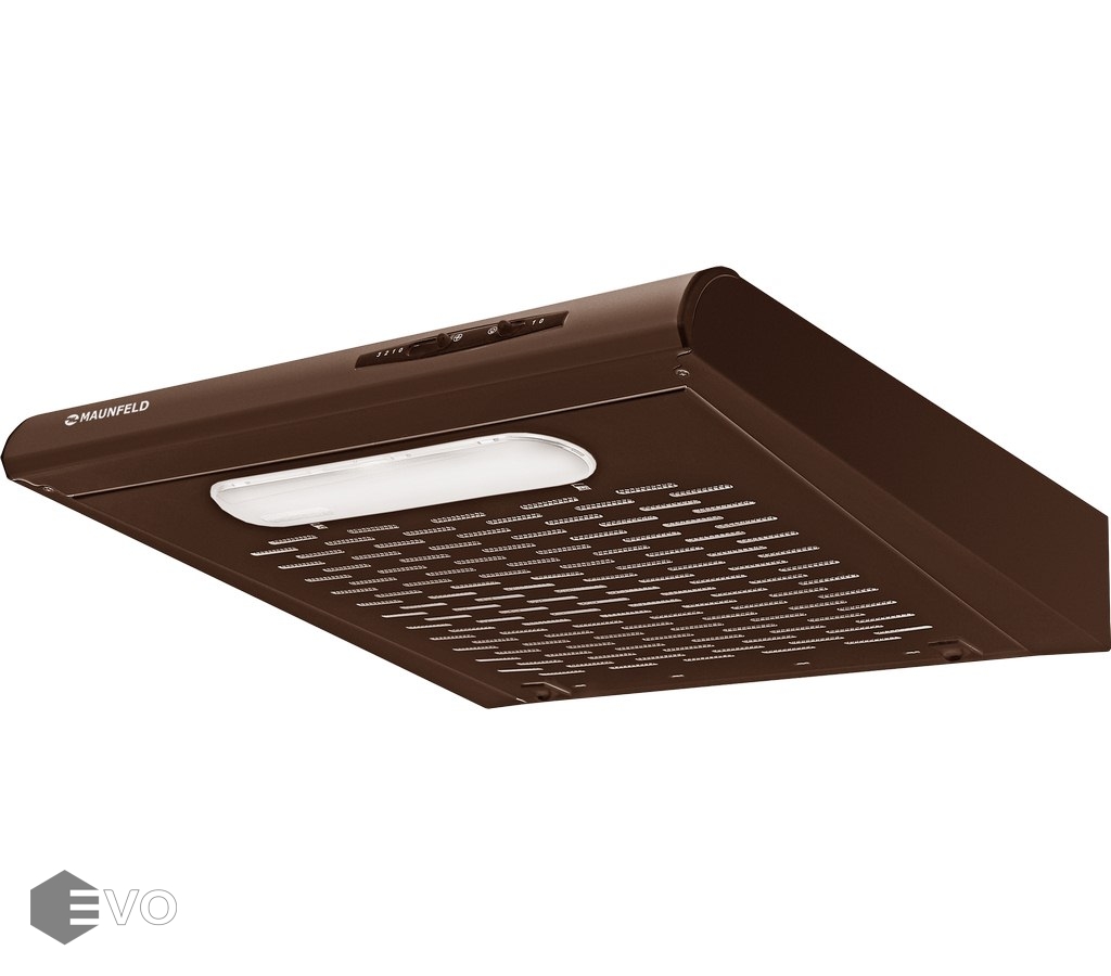 Козырьковая подвесная вытяжка MAUNFELD MPA 50 коричневый – подвесная кухонная вытяжка шириной 50 см, подойдет для небольшой кухни (до 12 кв. м). Может использоваться для отвода воздуха из помещения при подключении к системе домовой вентиляции или очищать воздух с помощью сменного угольного фильтра. Управление работой с помощью ползункового переключателя расположенного на торце вытяжки, позволяет выбрать одну из 3-х скоростей работы вентилятора и включить освещение.