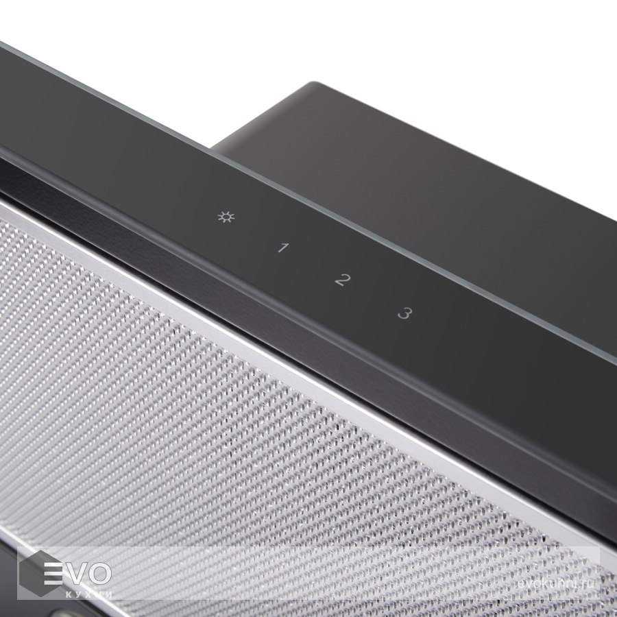 Фасад выдвижной панели выполнен из закаленного глянцевого стекла, на основной рабочей и выдвижной панелях находятся 2 многослойных жироулавливающих фильтра, которые легко вынимаются, что сильно упрощает чистку. Корпус сделан из нержавеющей стали. Дисплей сенсорного управления находится по центру фасадной панели. Вы можете выбрать одну из 3-х скоростей работы вентилятора и включить освещение.