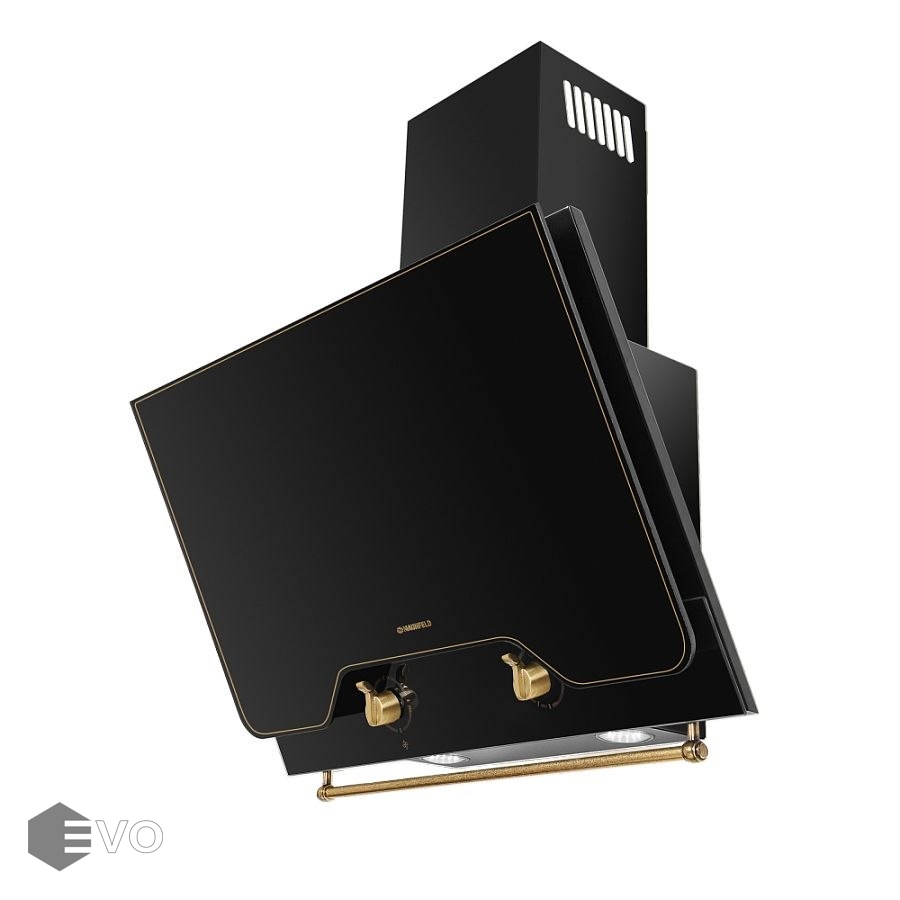 Работает в двух режимах – отвода (при подключении к системе вентиляции) и рециркуляции (при использовании сменного угольного фильтра). Корпус выполнен из нержавеющей стали с эмалированным покрытием матового черного цвета. Стильный откидной фасад из черного закаленного стекла прекрасно сочетается с ручками и рейлингом золотого цвета. За фасадом скрыт многослойный алюминиевый жироулавливающий фильтр, который легко снимается и полностью разбирается, что сильно упрощает чистку.