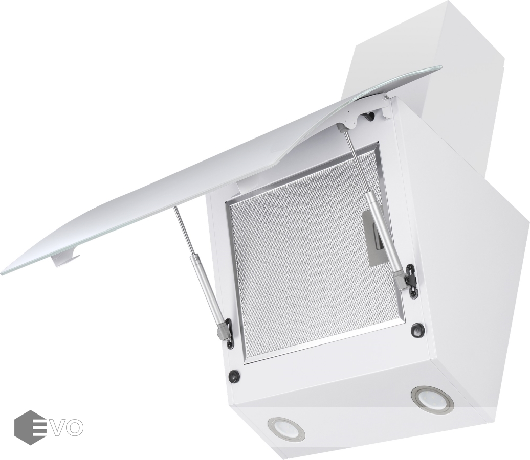 Корпус выполнен из нержавеющей стали с высококачественным эмалированным покрытием. Откидная фронтальная панель имеет оригинальную изогнутую форму, которая особенно удачно выглядит в исполнении из глянцевого закаленного стекла. За ней скрыт алюминиевый жироулавливающий фильтр, легко вынимающийся для чистки. Особое внимание заслуживает система фиксации откидной панели — это газлифты и магнитные защелки.