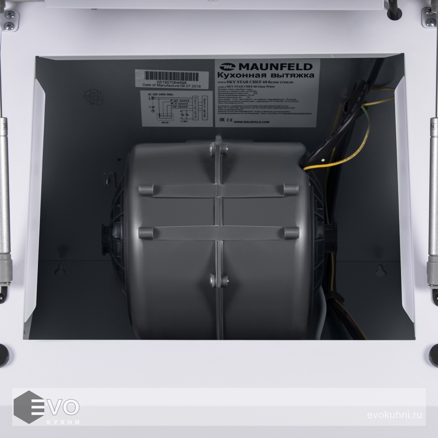 Наклонная вытяжка MAUNFELD Sky Star Chef 60 белый – вытяжка шириной 60 см крепится на стену над варочной панелью, оптимальное решение для кухни до 35 кв.м. Работает в двух режимах – отвода (при подключении к системе вентиляции) и рециркуляции (при использовании сменного угольного фильтра). Сенсорное управление осуществляется с помощью дисплея, расположенного фасаде. Можно включить: одну из 3-х скоростей, таймер (на 1 - 5 мин), свет (2 светодиодных элемента по 1 Вт).