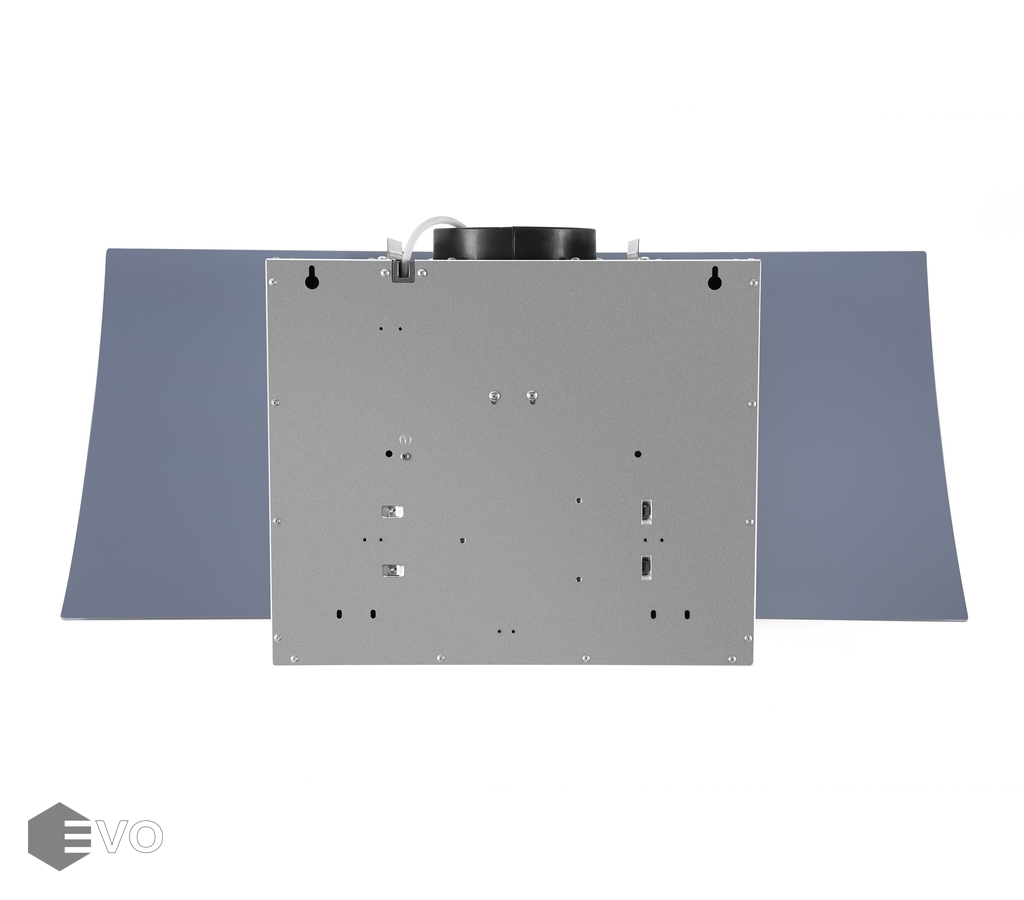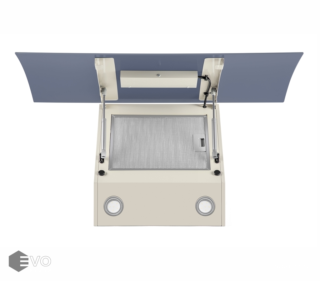 Корпус выполнен из нержавеющей стали с высококачественным эмалированным покрытием. Откидная фронтальная панель имеет оригинальную изогнутую форму, которая особенно удачно выглядит в исполнении из глянцевого закаленного стекла. За ней скрыт алюминиевый жироулавливающий фильтр, легко вынимающийся для чистки. Особое внимание заслуживает система фиксации откидной панели — это газлифты и магнитные защелки.