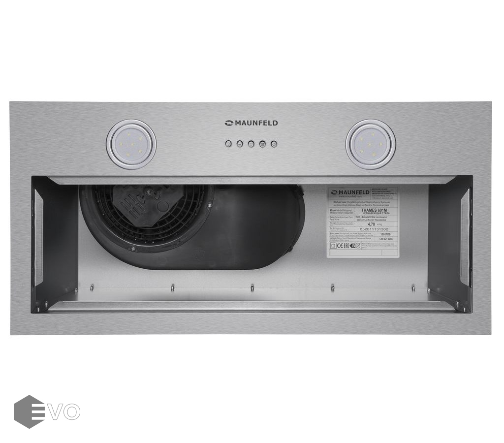 Полновстраиваемая вытяжка MAUNFELD THAMES 601M нержавеющая сталь – кухонная вытяжка шириной 60 см – оптимальное решение для небольшой кухни (до 15 кв.м). Модель встраивается в навесной шкаф над поверхностью плиты. Работает в двух режимах – отвода (при подключении к системе вентиляции) и рециркуляции (при использовании сменного угольного фильтра).