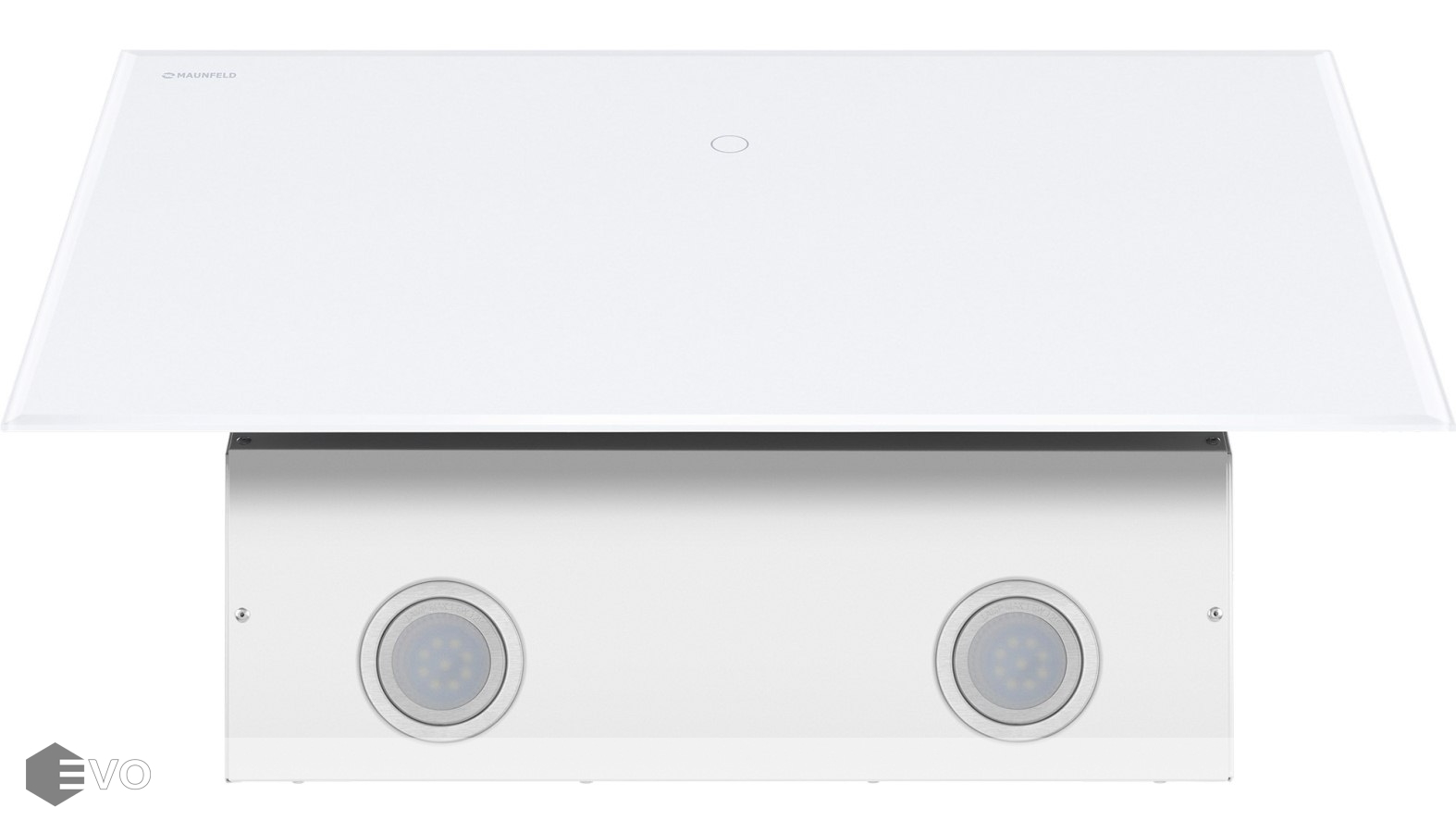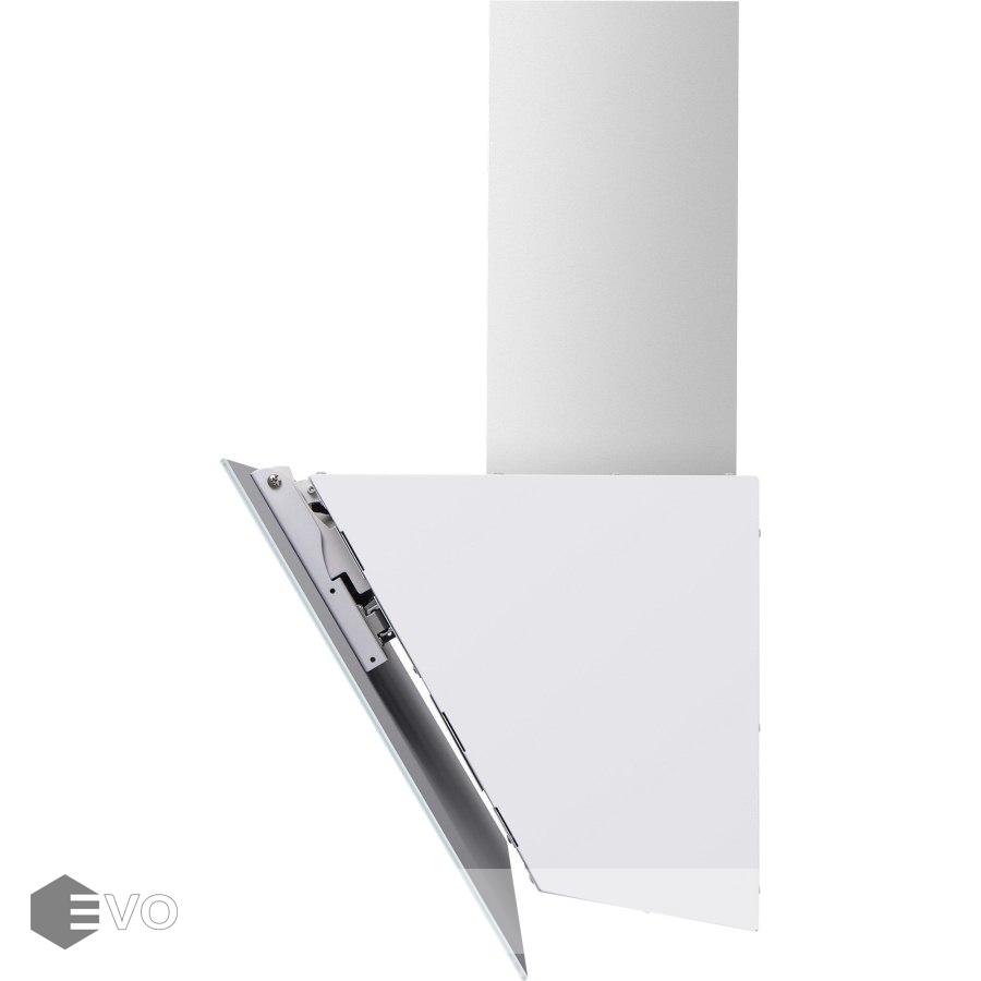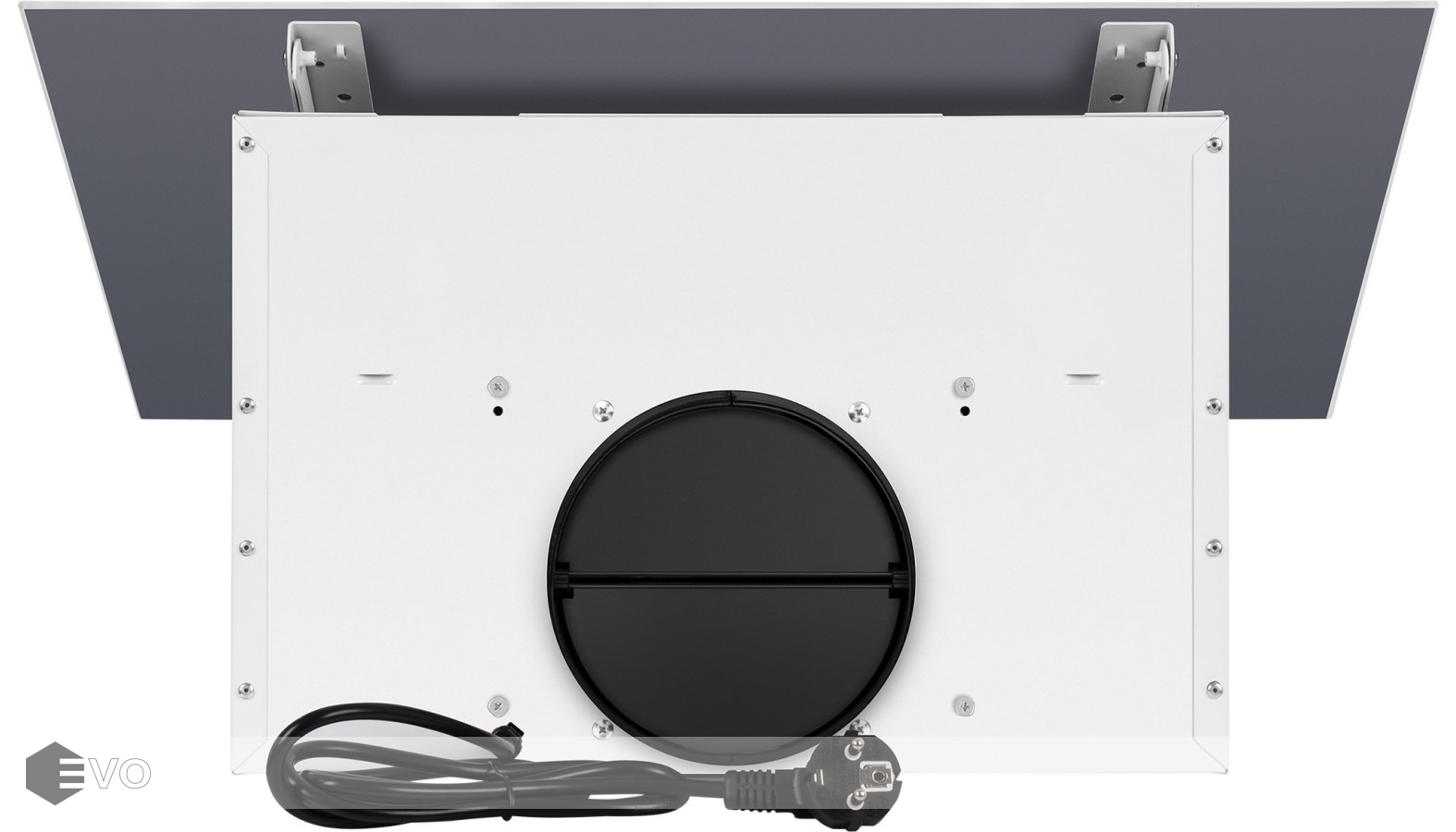 Корпус выполнен из нержавеющей стали. Откидная панель, выполненная из закаленного белого цвета с фацетом, скрывает легко снимающийся алюминиевый жироулавливающий фильтр. Загрязненный воздух втягивается по периметру всей откидной панели.