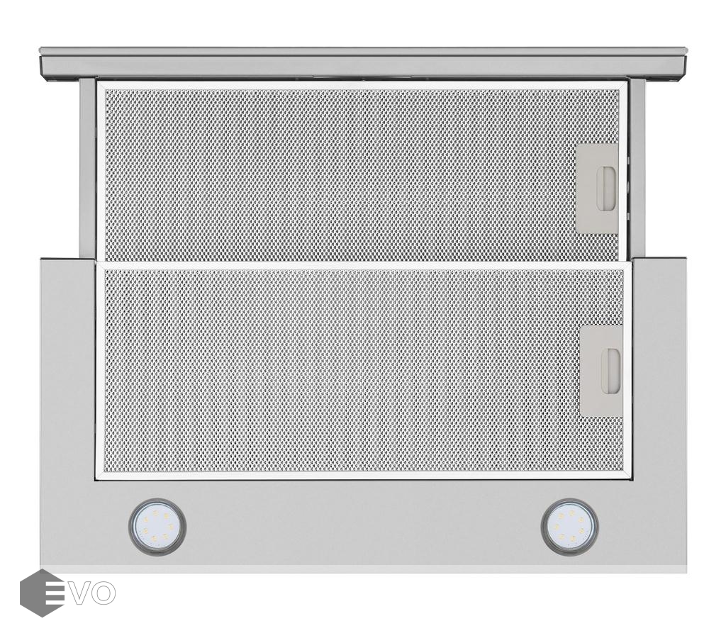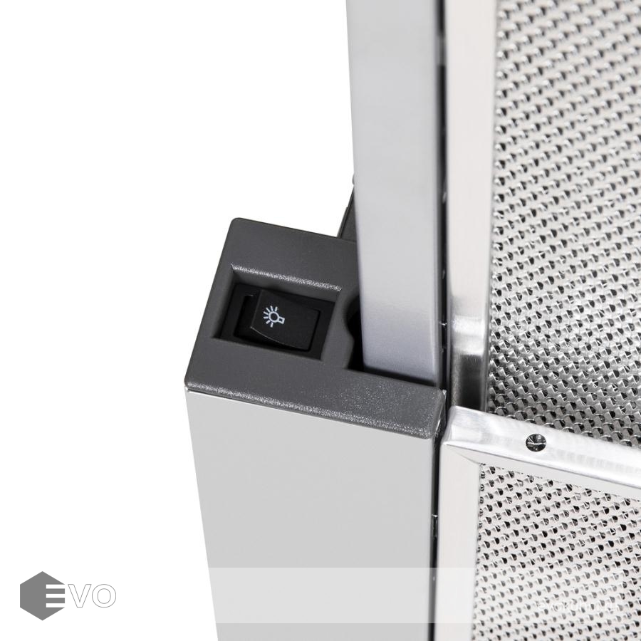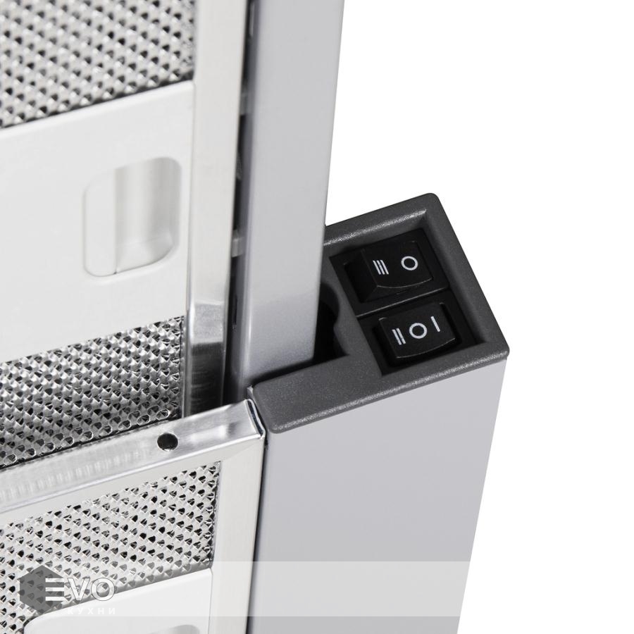 Фасад выдвижной панели выполнен из закаленного стекла белого цвета. При желании вы можете поменять его на фасад любого другого цвета из нашей линейки. Корпус сделан из матированной нержавеющей стали. Два многослойных жироулавливающих фильтра из алюминия легко вынимаются из вытяжки и полностью разбираются, что сильно упрощает их чистку. Управление вытяжкой осуществляется двумя клавишными переключателями, скрытых в торце рабочей панели, Вы можете выбрать одну из 3-х скоростей вентилятора и включить освещение.