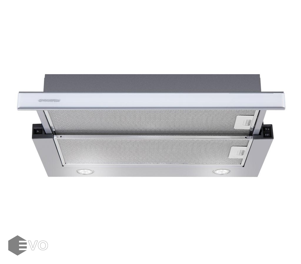 Выдвижная вытяжка MAUNFELD VS Slide 60 металлик\белое стекло – телескопическая кухонная вытяжка с шириной 60 см благодаря выдвижному козырьку может эффективно очищать загрязненный воздух на кухне до 20 кв.м. Модель встраивается в навесной шкаф над поверхностью плиты. Работает в 2-х режимах – отвода (при подключении к системе вентиляции) и рециркуляции (при использовании сменного угольного фильтра).