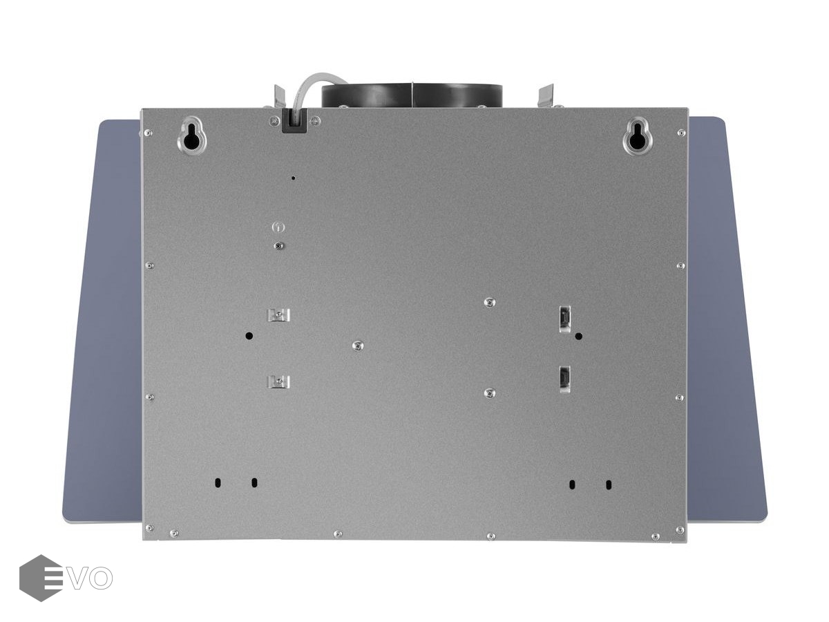 Корпус из нержавеющей стали выполнен в едином цвете с фронтальными панелями из закаленного стекла. Откидная панель надежно фиксируется магнитными защелками и скрывает алюминиевый жироулавливающий фильтр, который легко снимается и полностью разбирается, что сильно упрощает чистку. Загрязненный воздух втягивается по всему периметру откидной панели.