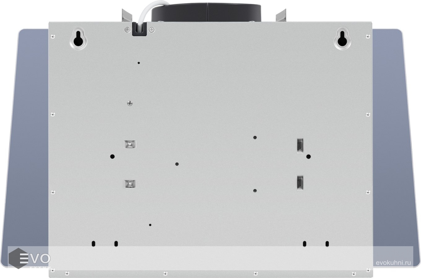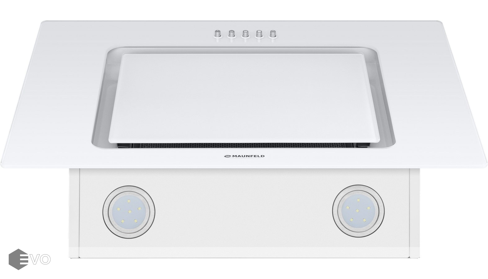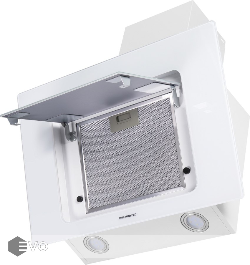 Корпус из нержавеющей стали с покрытием белого цвета удачно сочетается с фасадом, выполненным из закаленного стекла. Откидная панель расположена по центру фасада и скрывается металлический  жироулавливающий фильтр, который легко вынимается и полностью разбирается для чистки. В данной модели реализовано  периметральное втягивание загрязненного воздуха.