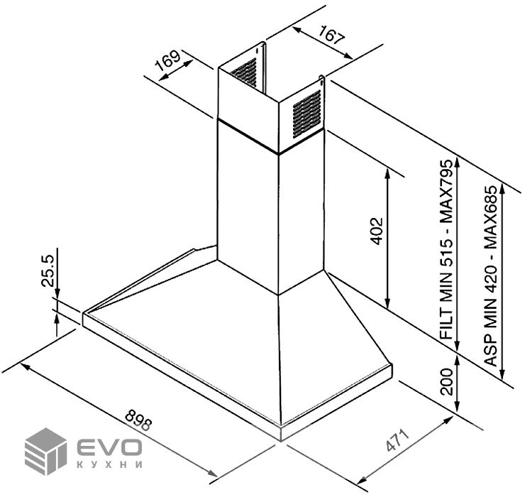 • Высота установки над электрическими варочными поверхностями, мм: 650