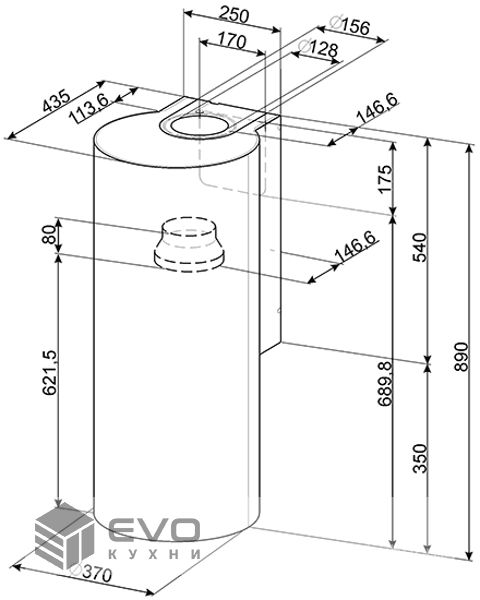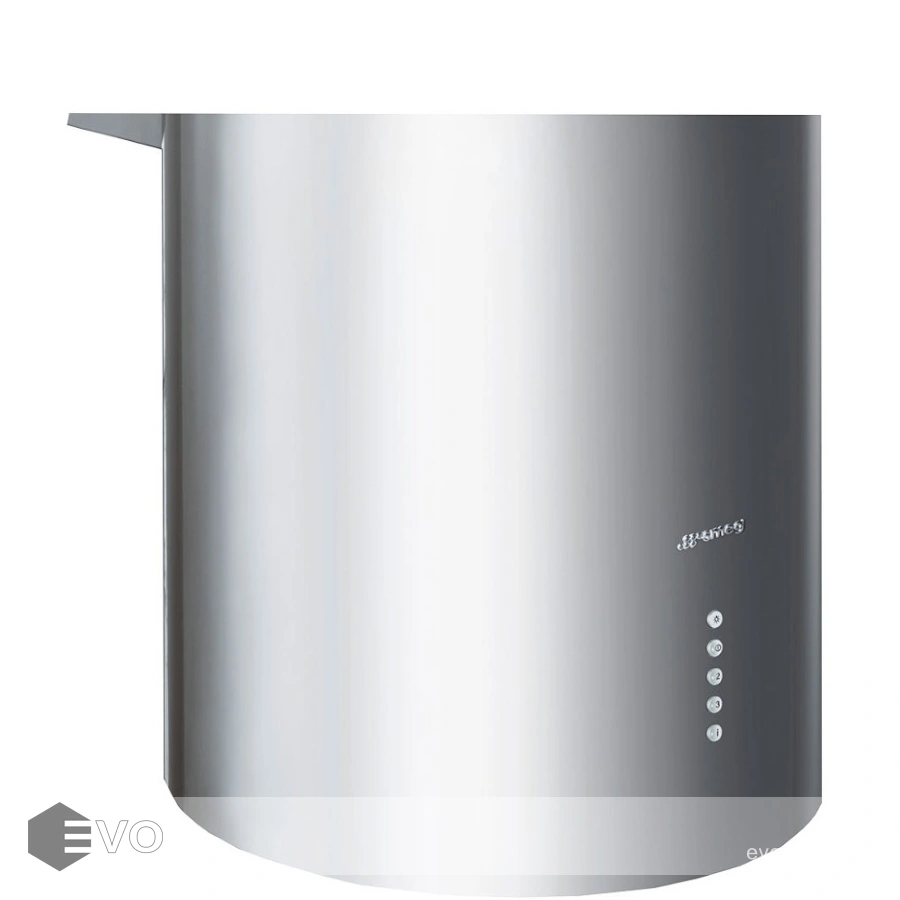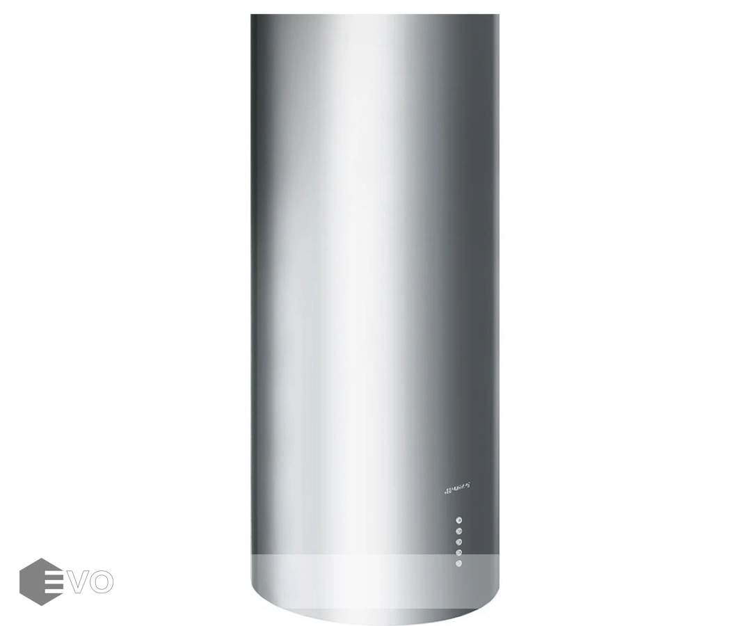 Модель оригинального дизайна в виде цилиндра выполнена в цвете матовой нержавеющей стали. Для эффективной очистки воздуха различной степени загрязненности вытяжка оснащена тремя скоростями всасывания. Электронная кнопочная панель управления располагается на корпусе справа: она позволяет установить параметры работы одним нажатием, а также включить освещение рабочего места.