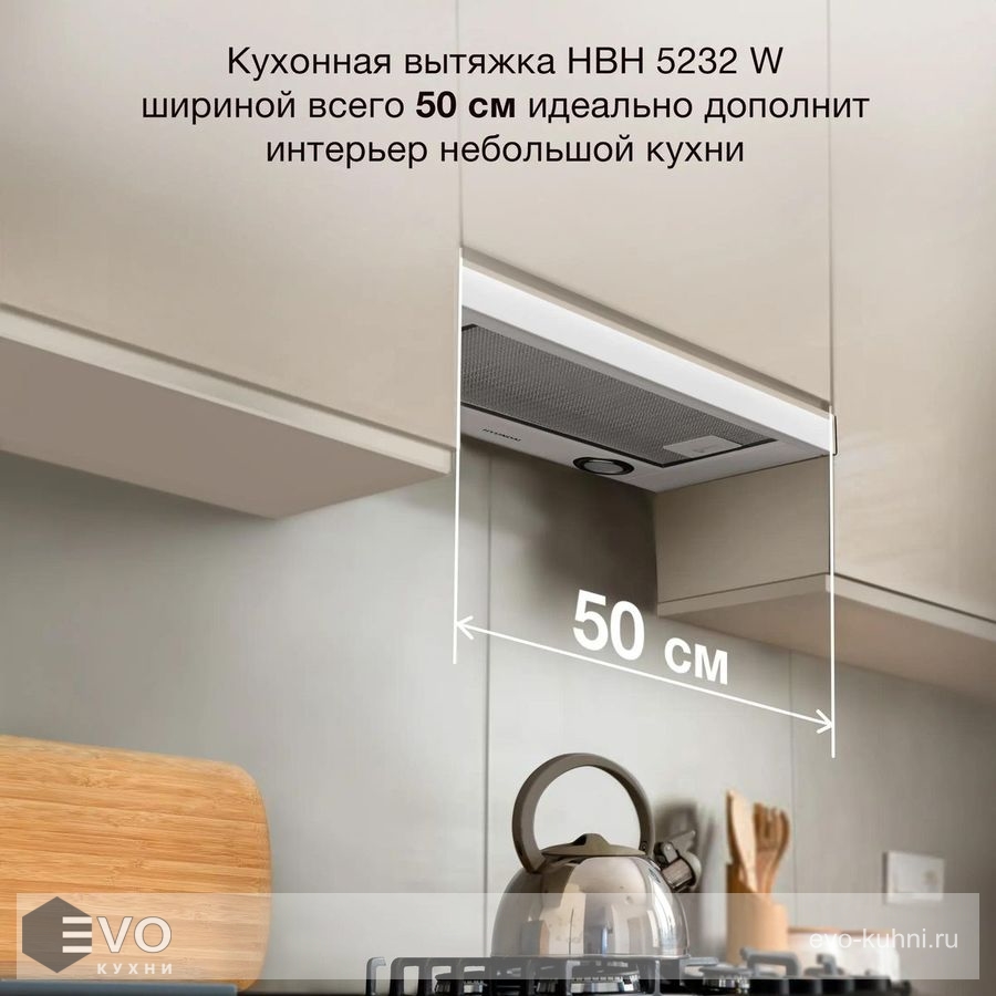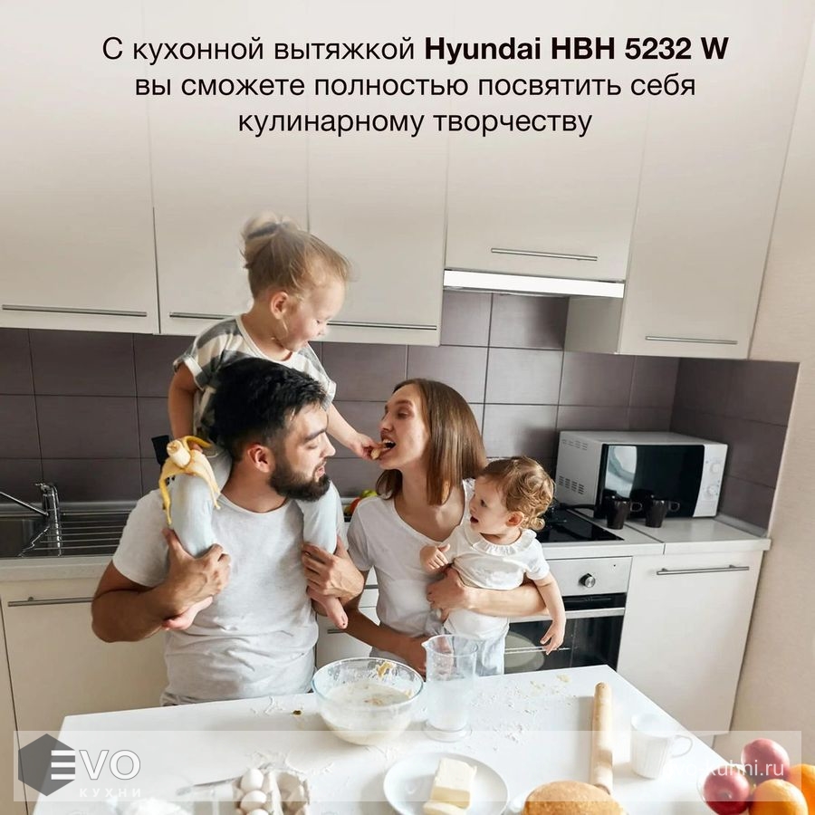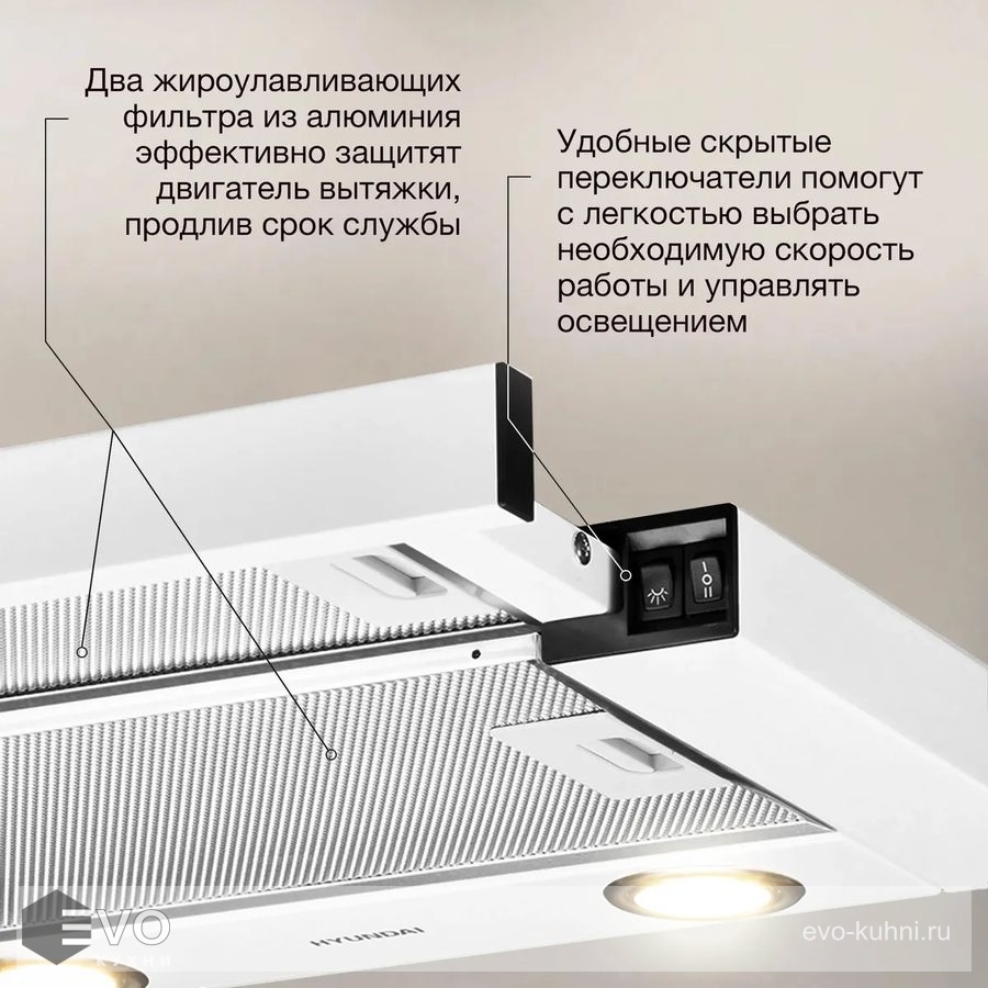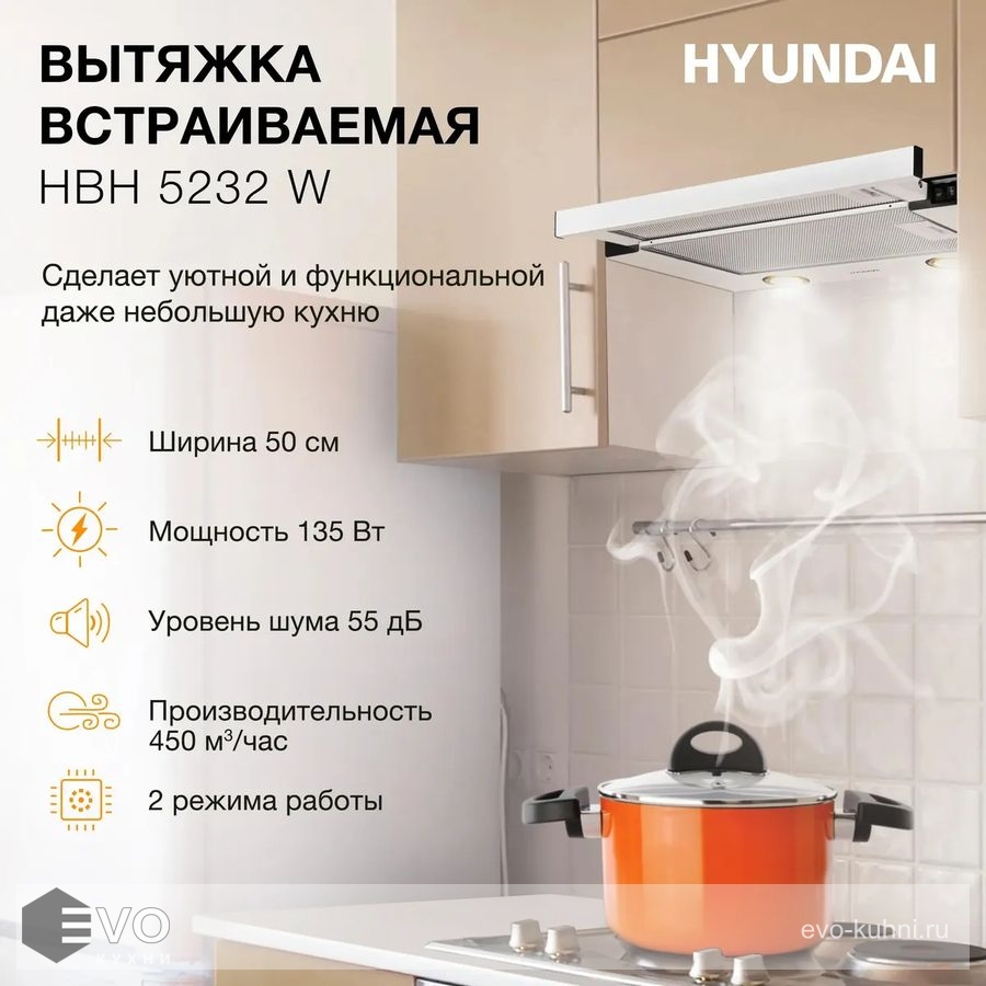 Специально для кухонь с небольшой площадью специалисты Hyundai создали кухонную вытяжку HBH 5232 W шириной всего 50 см. Несмотря на свои компактные размеры, в этом приборе предусмотрен моющийся жироулавливающий фильтр, два светодиодных светильника и скрытая панель управления.