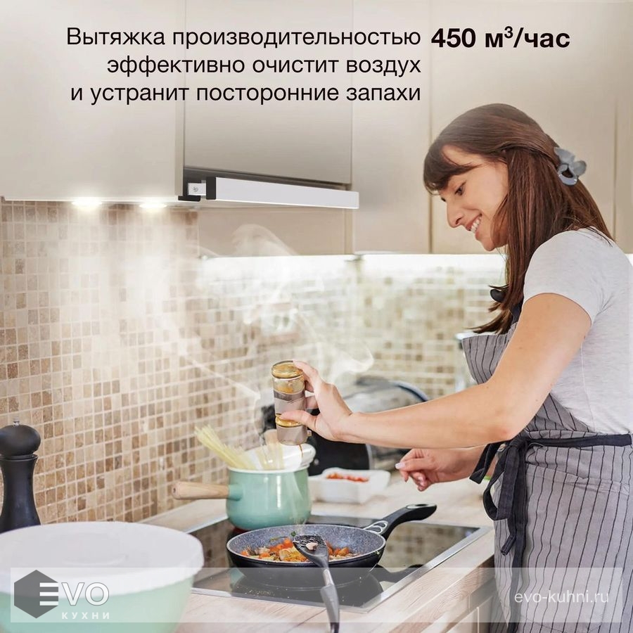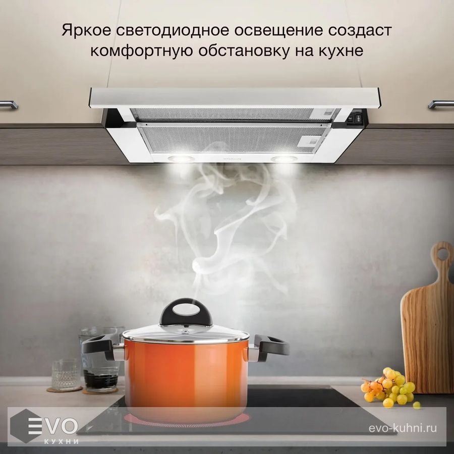 Два встроенных светодиодных светильника удобны и в процессе приготовления пищи – освещают рабочую поверхности, и для создания уютной обстановки - когда хочется насладиться тишиной и приятным напитком. Белый цвет вытяжки хорошо сочетается с кухнями, выполненными в модерновом и классическом исполнении.
