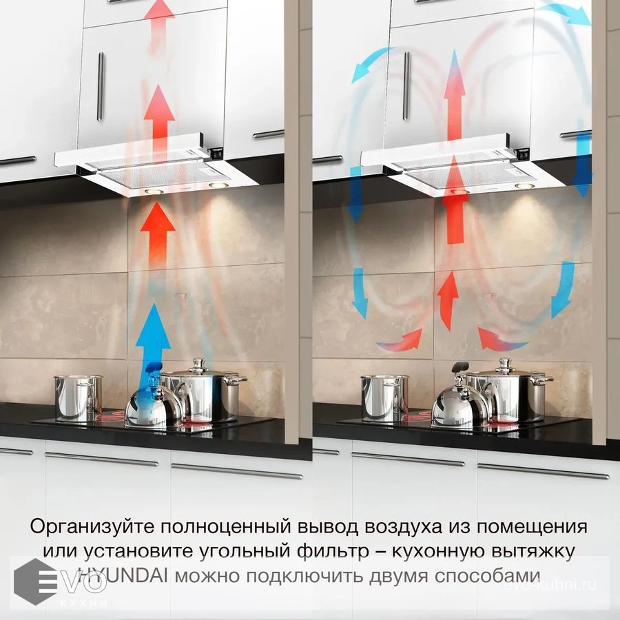 Кухонная вытяжка HYUNDAI HBH 5232 W может работать как на отвод воздуха в вентиляцию (потребуется подключение воздушного канала диаметром 120 мм), так и в режиме рециркуляции (потребуется установка сменных угольных фильтров).