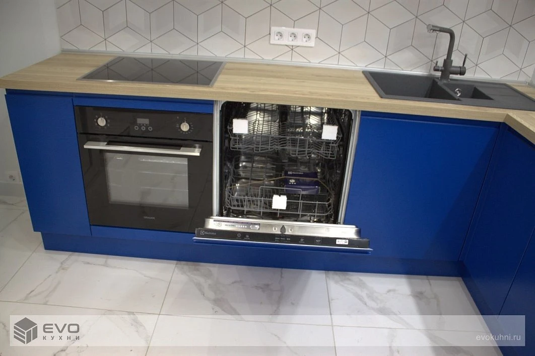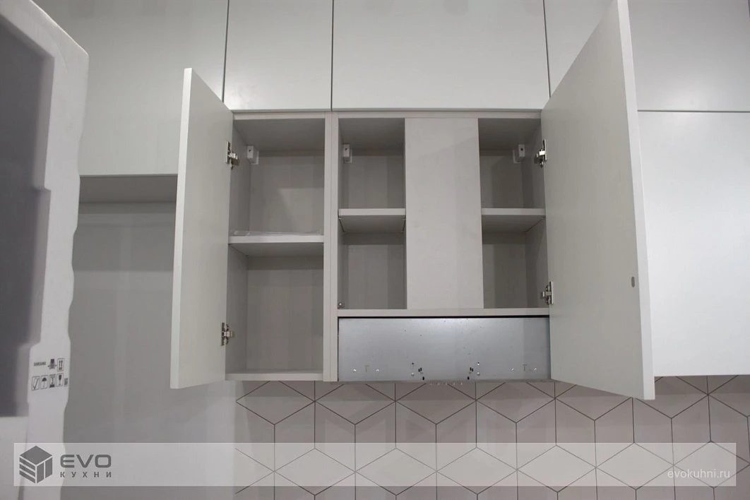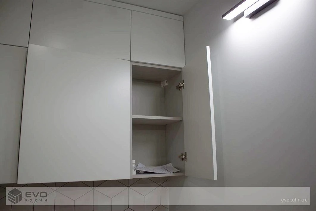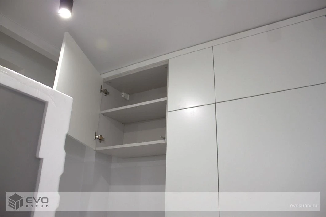 - Особенности: кухня с интегрированными фасадами под ручки и верхними шкафами под потолок