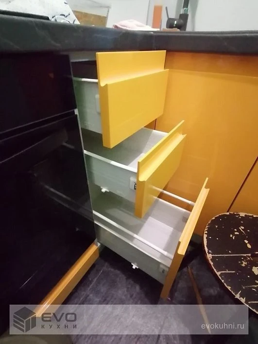 - Фасады: МДФ Эмаль с интегрированной ручкой RAL9003 глянец / RAL 1033 глянец.