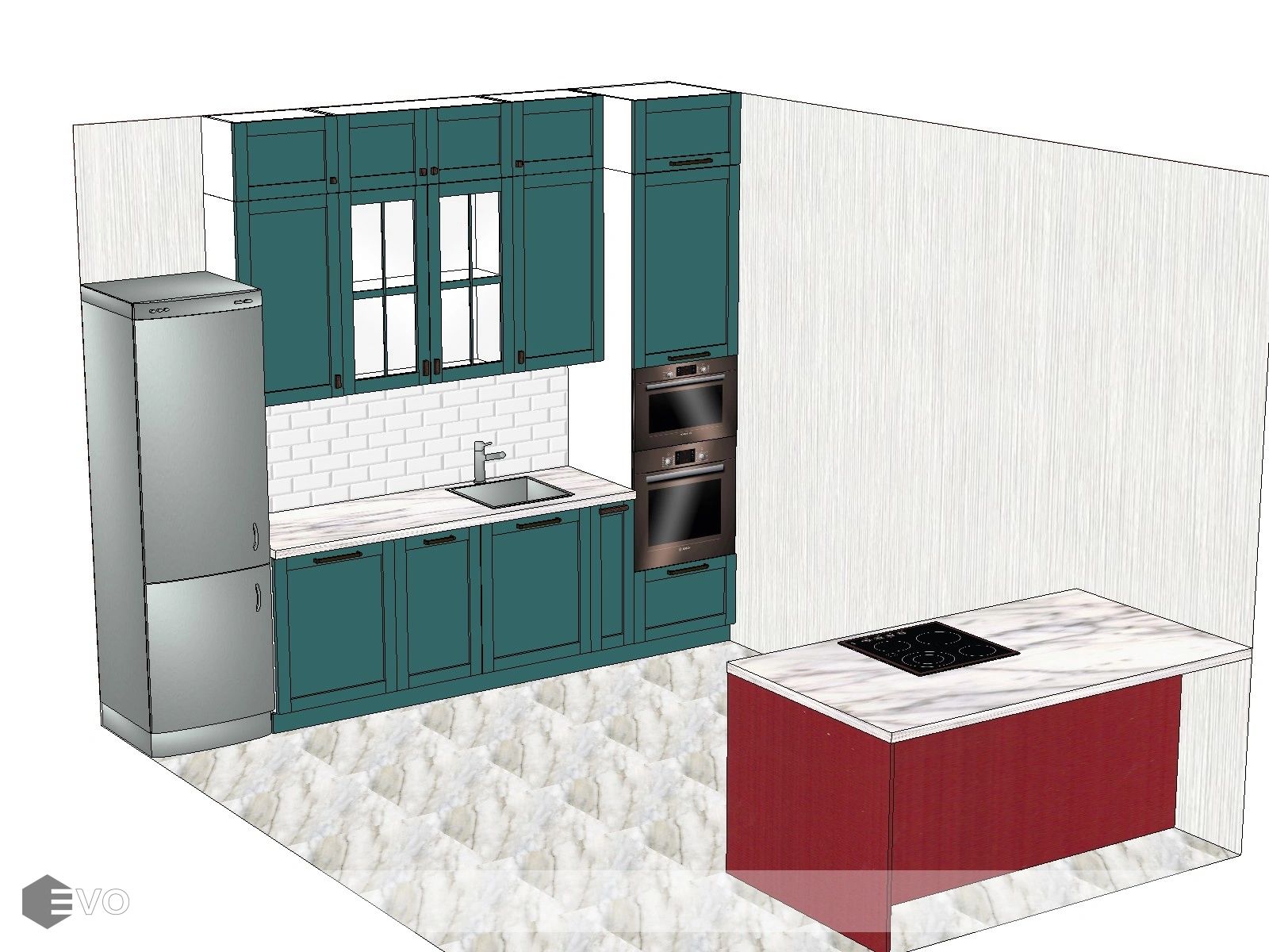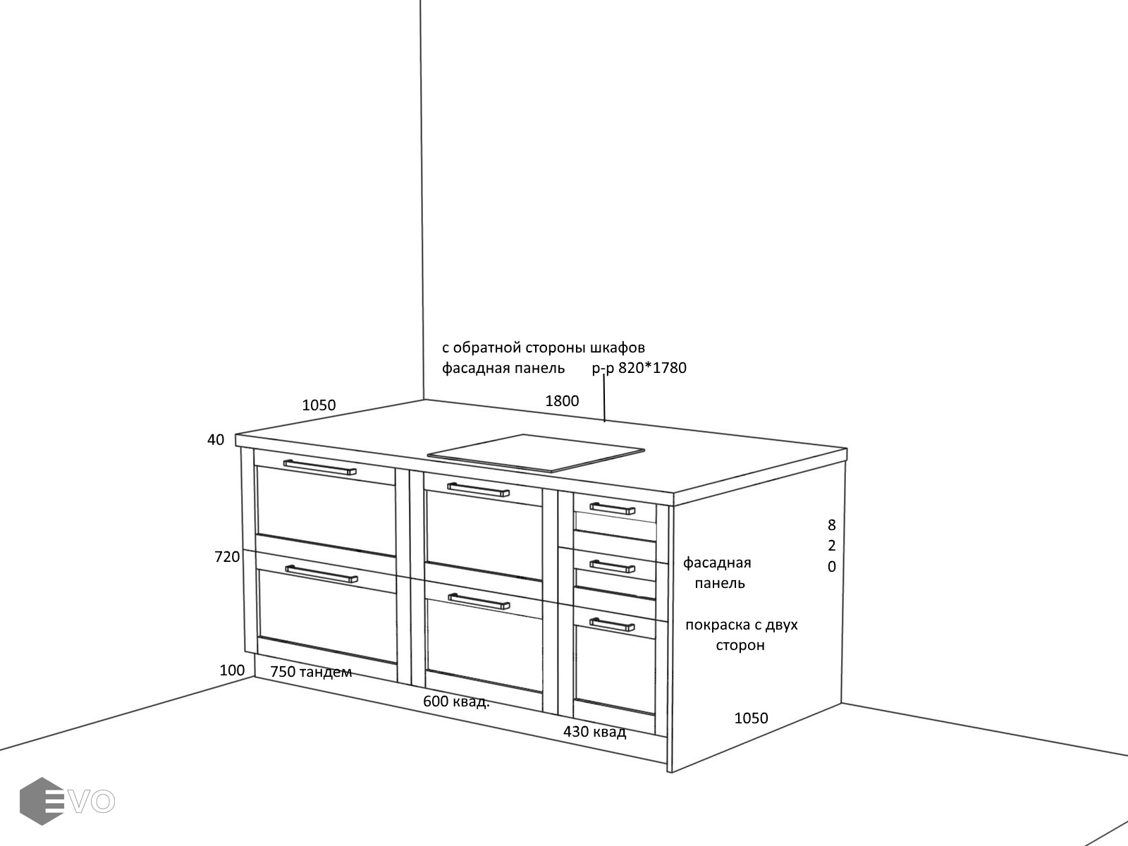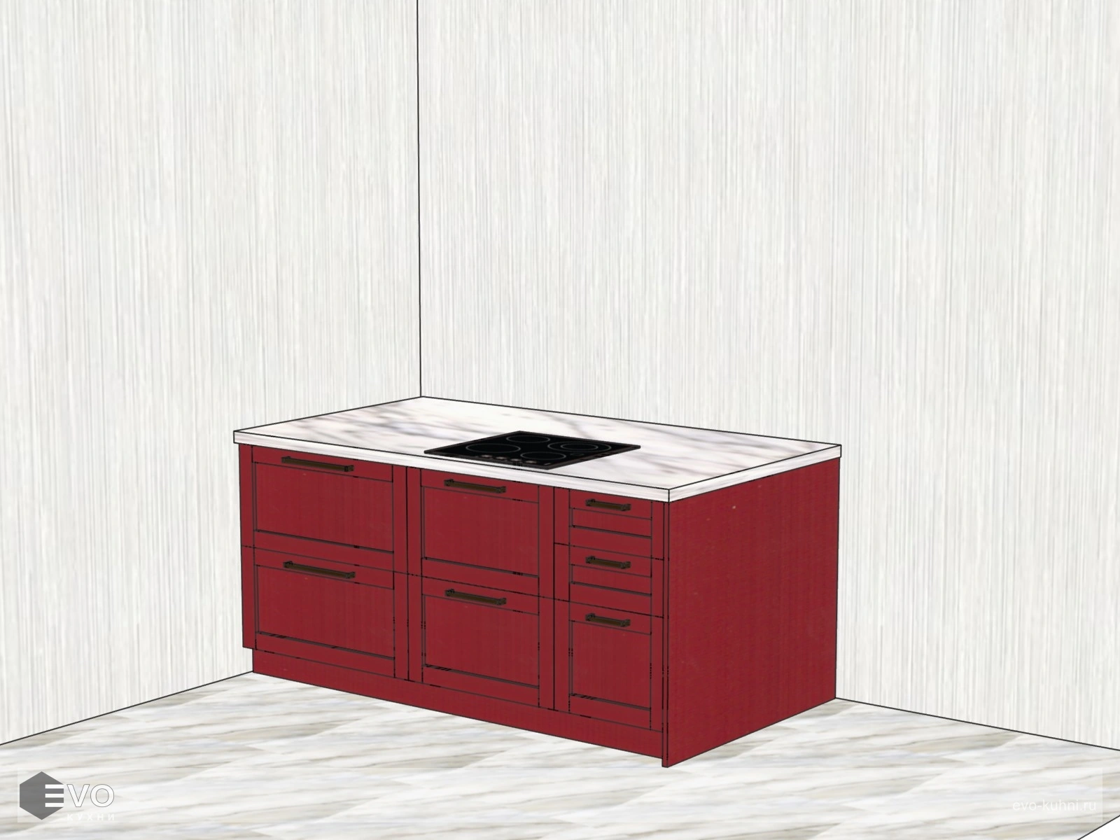 - Размеры: 3070мм, остров 1800*1050мм, Высота: 2730мм,