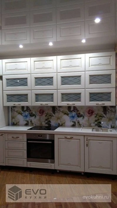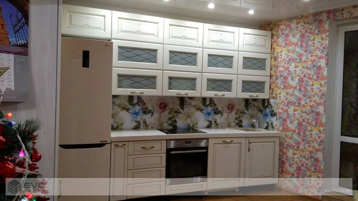 Прямая кухня классика с пеналом ПанФасад шкафы 3 яруса Массив дерева