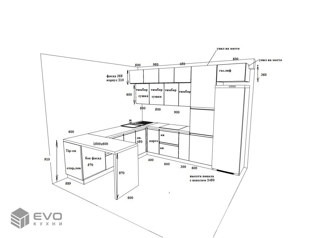 Кухни все изготавливаются по индивидуальному заказу. Мы подготовим дизайн-проект под любое помещение и конфигурацию. В зависимости от выбранных фасадов сможем изготовить нестандартные модули и размеры. Однако есть редкие исключения видов фасадов, по которым невозможны нестандарты, об этом вас предупредит дизайнер при выборе материалов для проекта.