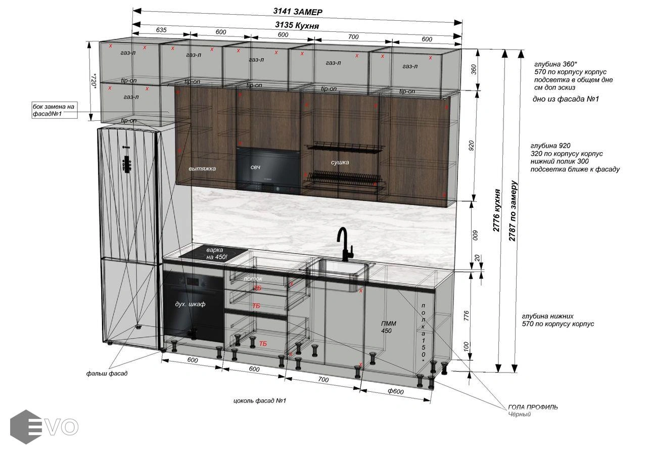 Дизайн-проект, максимально удовлетворяющий вашим пожеланиям, мы делаем бесплатно. Наши менеджеры-дизайнеры помогут вам определиться с моделью вашей будущей кухни, грамотно подберут встраиваемую технику, подберут цветовую гамму самой кухни исходя из стилистики интерьера и пожеланий клиента, составят технически грамотный проект под размеры помещения.