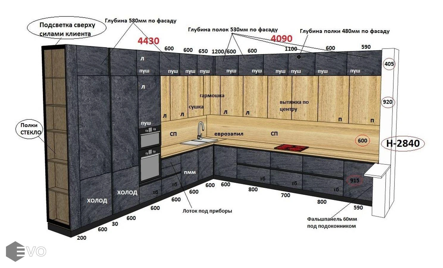 - Размеры: 4430*4090мм,остров 1700х800мм. Высота: 2840мм.