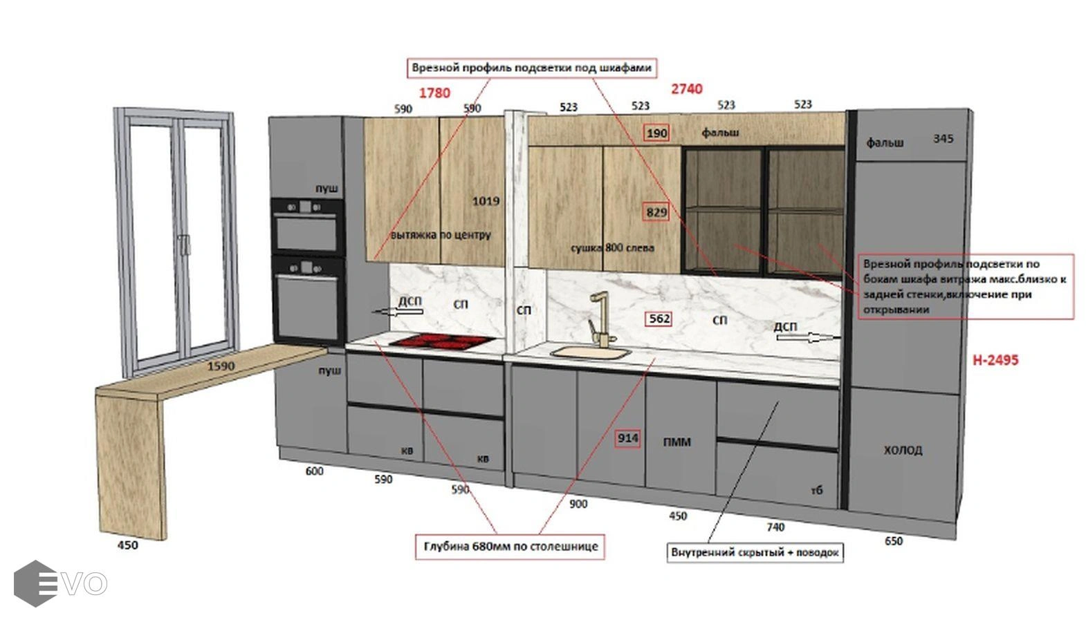 Дизайн-проект, максимально удовлетворяющий вашим пожеланиям, мы делаем бесплатно. Наши менеджеры-дизайнеры помогут вам определиться с моделью вашей будущей кухни, грамотно подберут встраиваемую технику, подберут цветовую гамму самой кухни исходя из стилистики интерьера и пожеланий клиента, составят технически грамотный проект под размеры помещения.