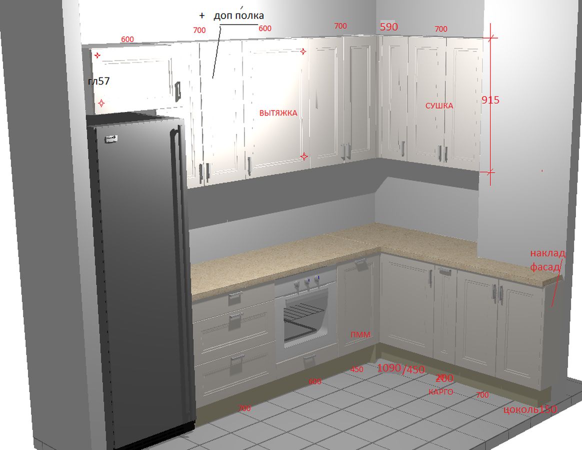 Кухни все изготавливаются по индивидуальному заказу. Мы подготовим дизайн-проект под любое помещение и конфигурацию. В зависимости от выбранных фасадов сможем изготовить нестандартные модули и размеры. Однако есть редкие исключения видов фасадов, по которым невозможны нестандарты, об этом вас предупредит дизайнер при выборе материалов для проекта.
