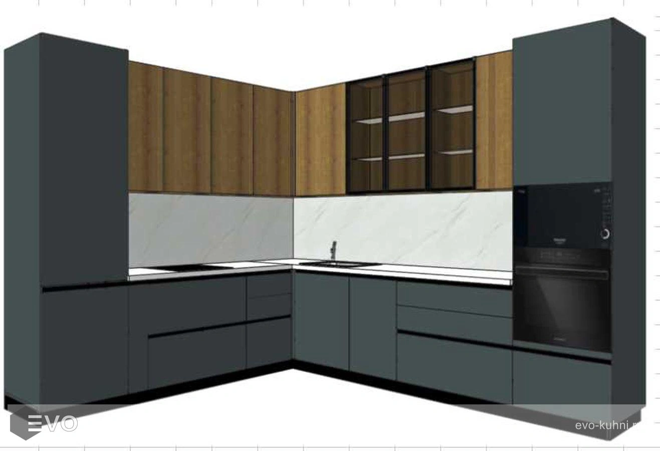 - Фасады: МДФ Пластик AGT 3023 Dolphin grey (низ и пеналы)/ Egger H1344 ST32 Дуб Шерман коньяк коричневый (верхние шкафы)•Каркас: ЛДСП 18 мм Egger U963 ST9 Диамант серый (низ и пеналы)/Egger H1344 ST32 Дуб Шерман коньяк коричневый (верхние шкафы)