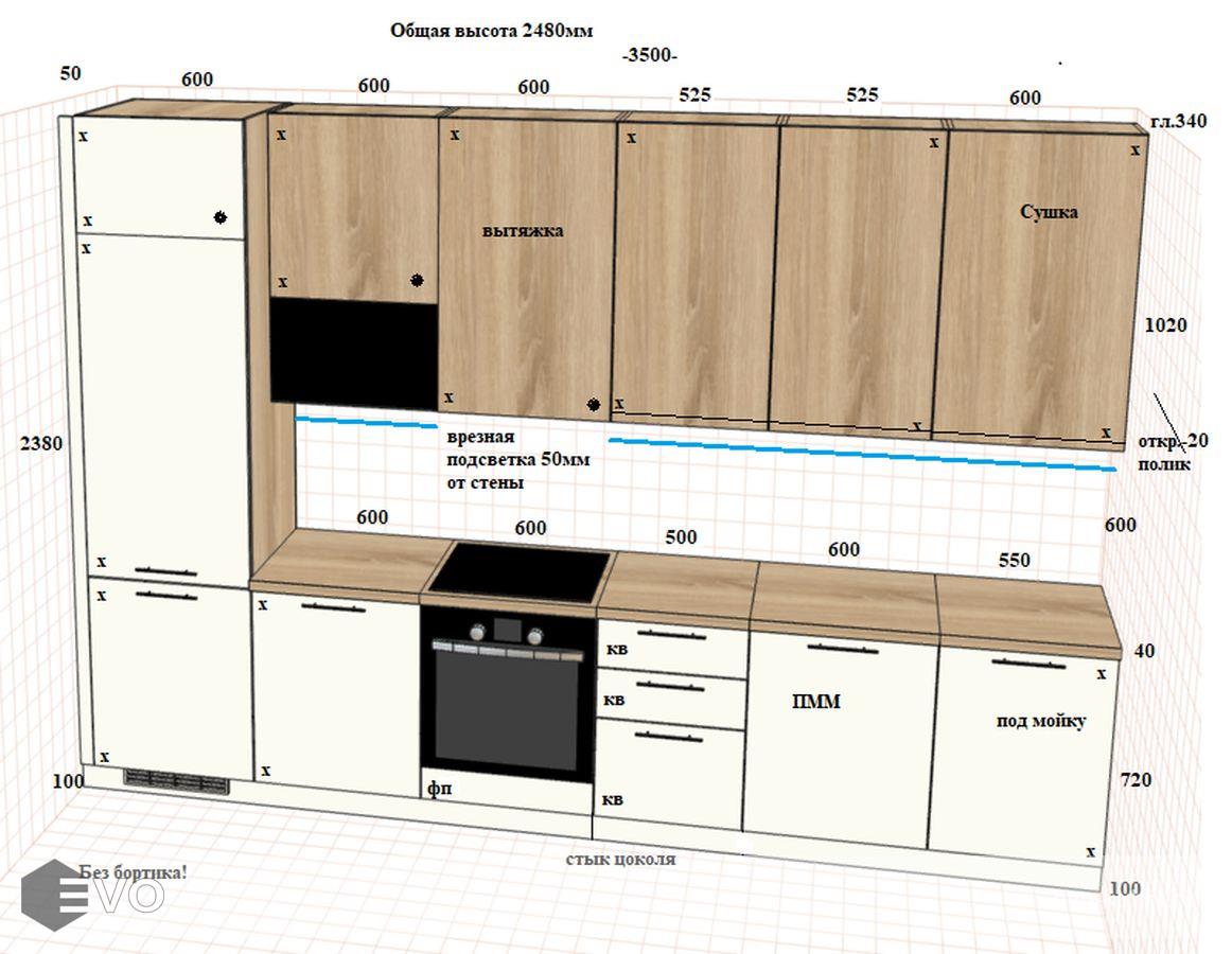 Кухни все изготавливаются по индивидуальному заказу. Мы подготовим дизайн-проект под любое помещение и конфигурацию. В зависимости от выбранных фасадов сможем изготовить нестандартные модули и размеры. Однако есть редкие исключения видов фасадов, по которым невозможны нестандарты, об этом вас предупредит дизайнер при выборе материалов для проекта.