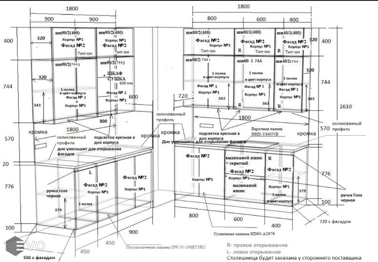 Кухни все изготавливаются по индивидуальному заказу. Мы подготовим дизайн-проект под любое помещение и конфигурацию. В зависимости от выбранных фасадов сможем изготовить нестандартные модули и размеры. Однако есть редкие исключения видов фасадов, по которым невозможны нестандарты, об этом вас предупредит дизайнер при выборе материалов для проекта.