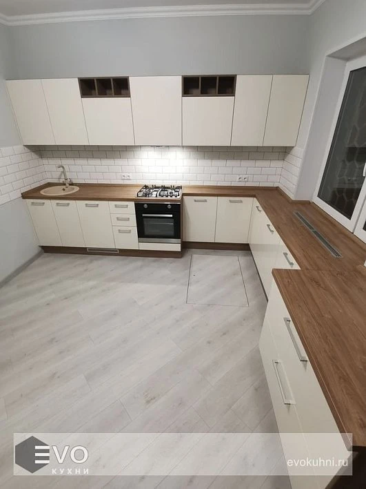 Просторная угловая уютная кухня в светлых тонах в стиле модерн.